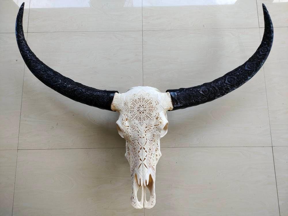 This hand carved buffalo skull is a one-of-a-kind tribal art sculpture, featuring an intricate mandala carving created entirely by hand.