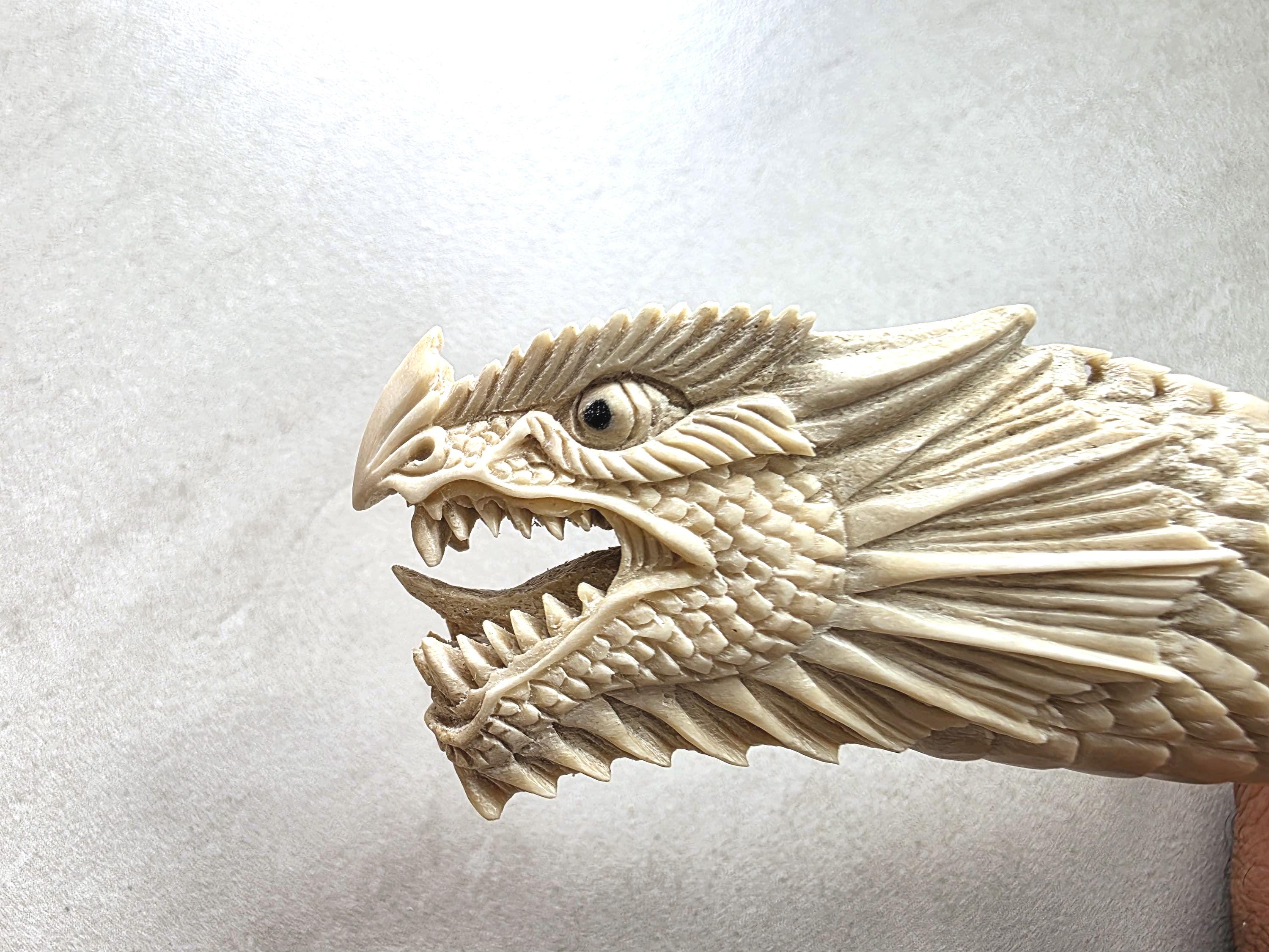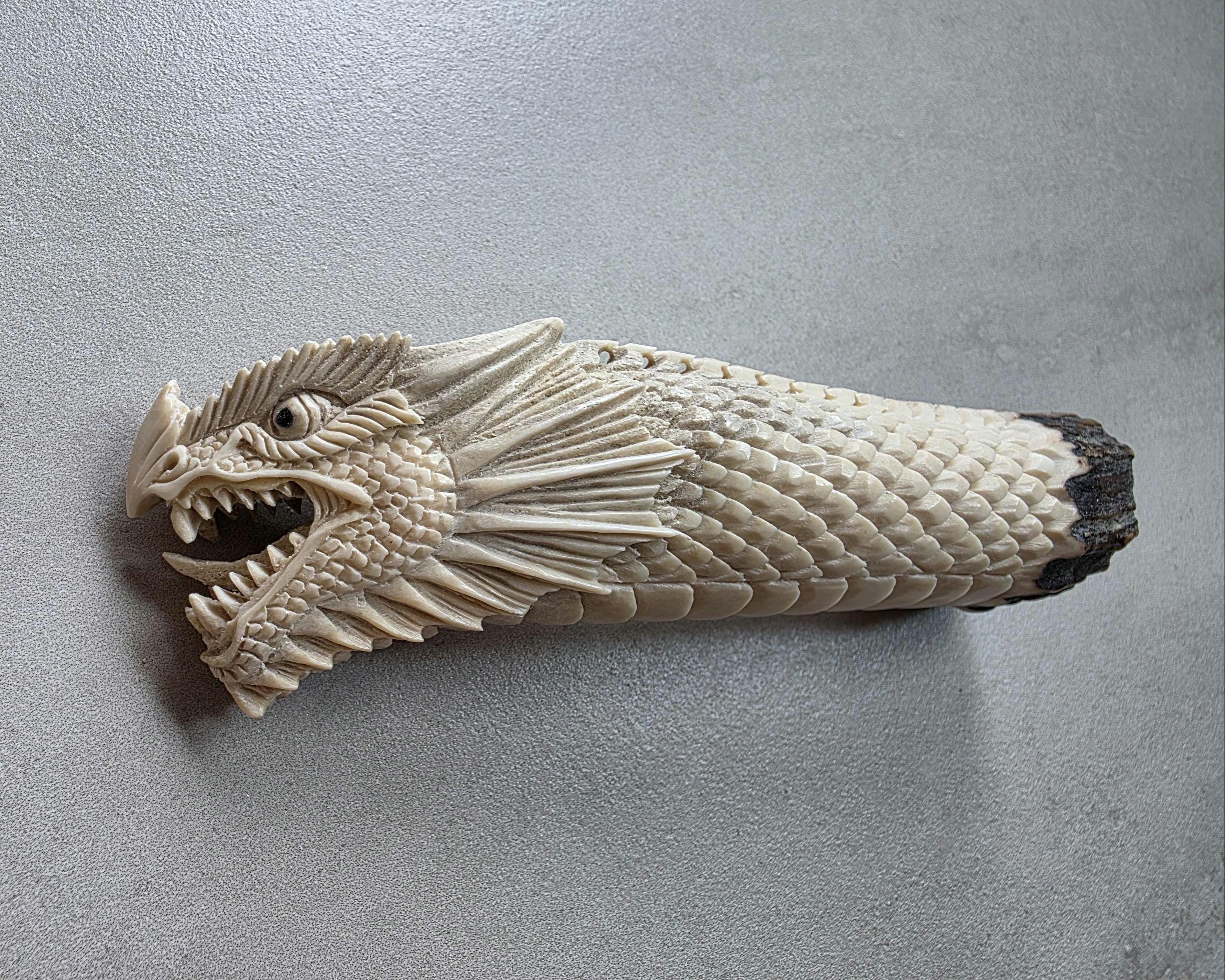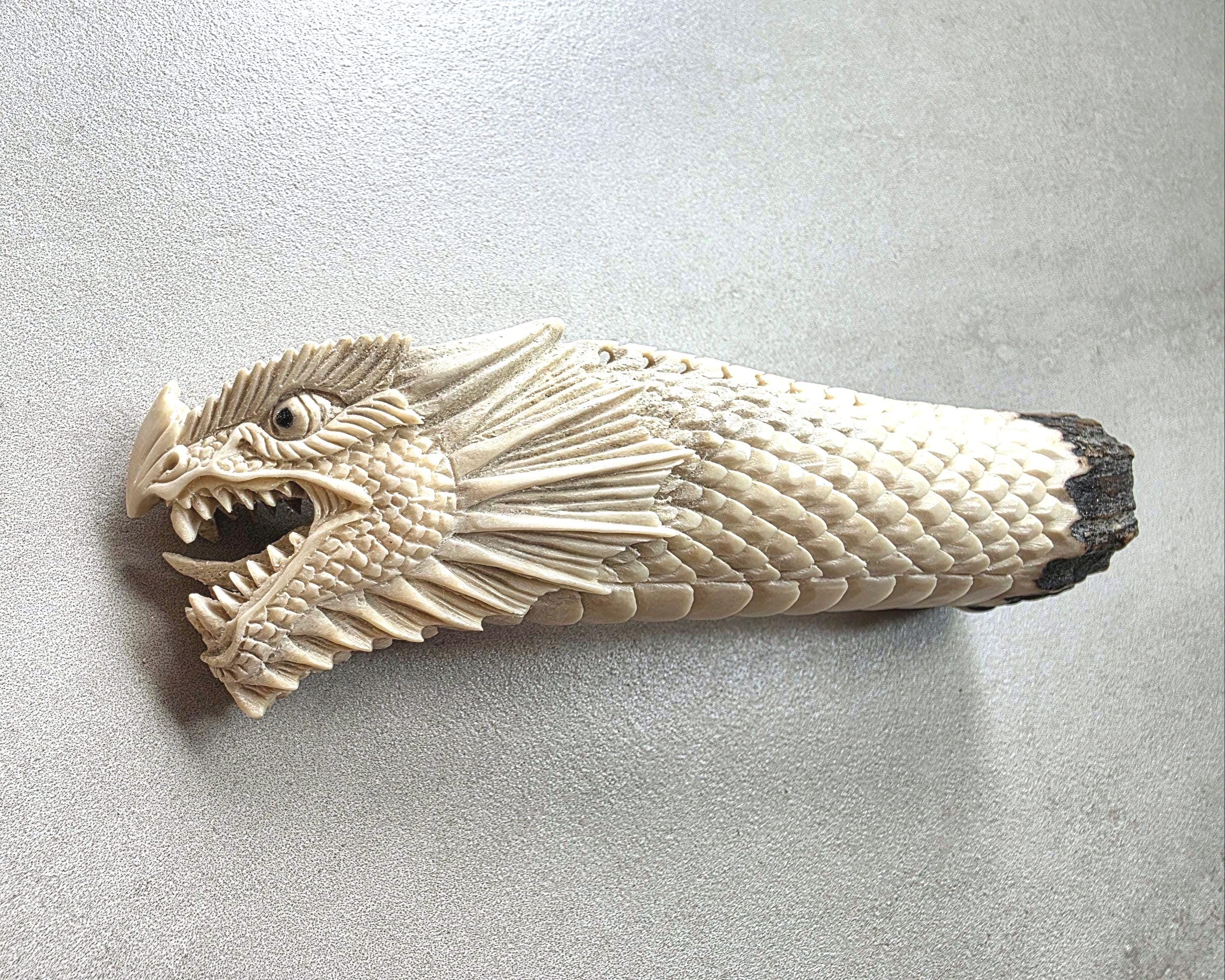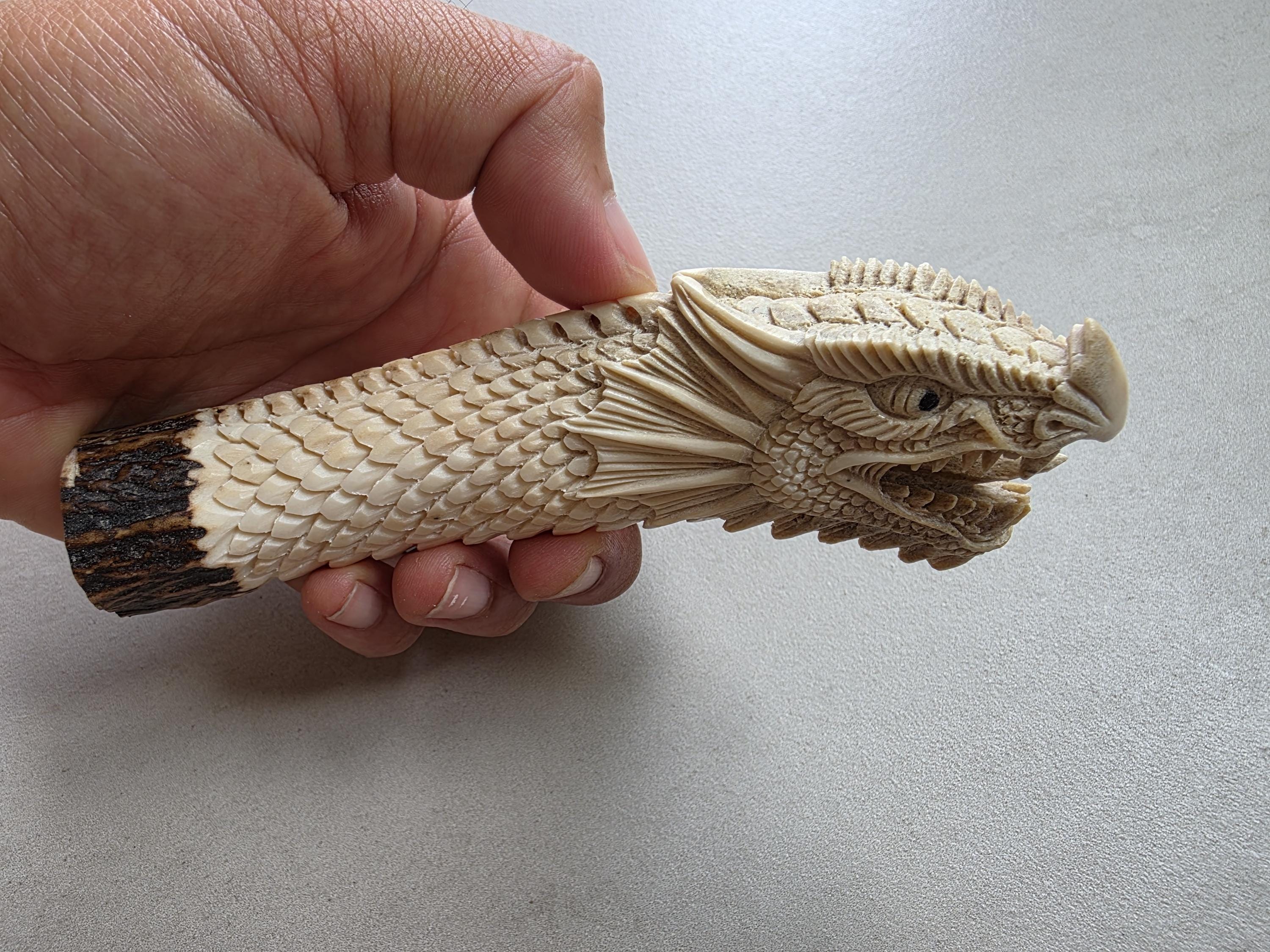 The natural ivory tone of the antler enhances every carved detail, creating depth and contrast across the dragon’s scales and face.