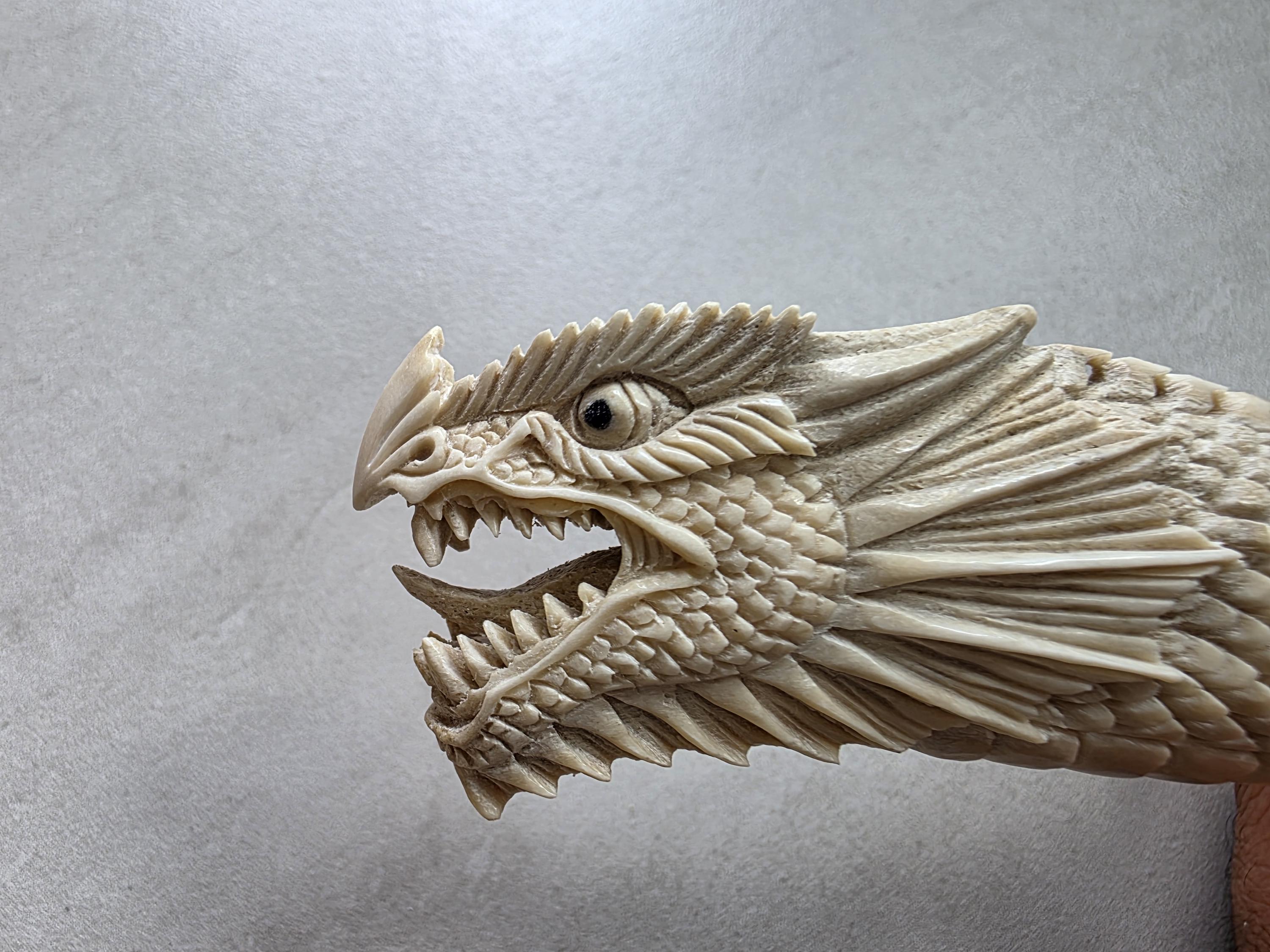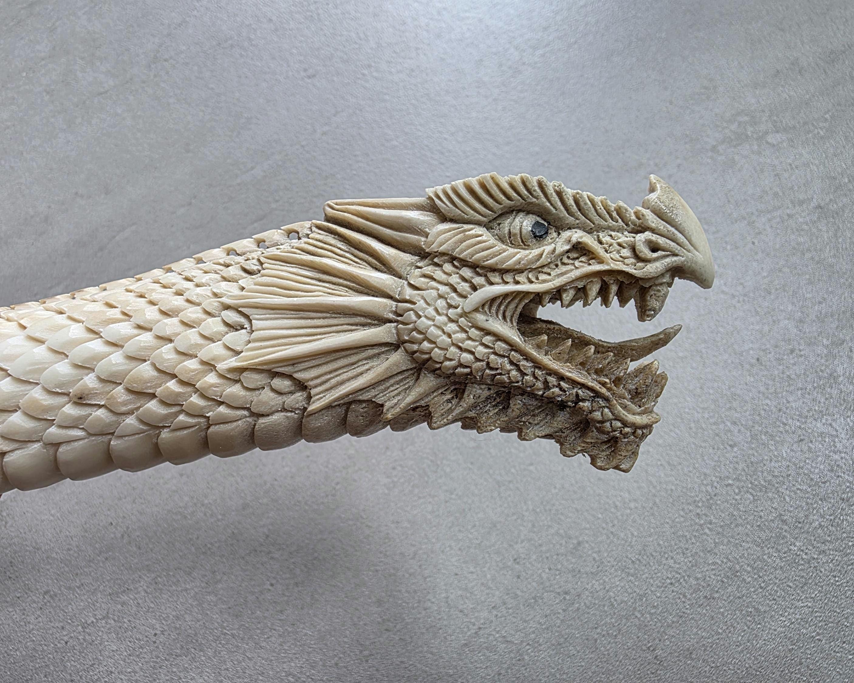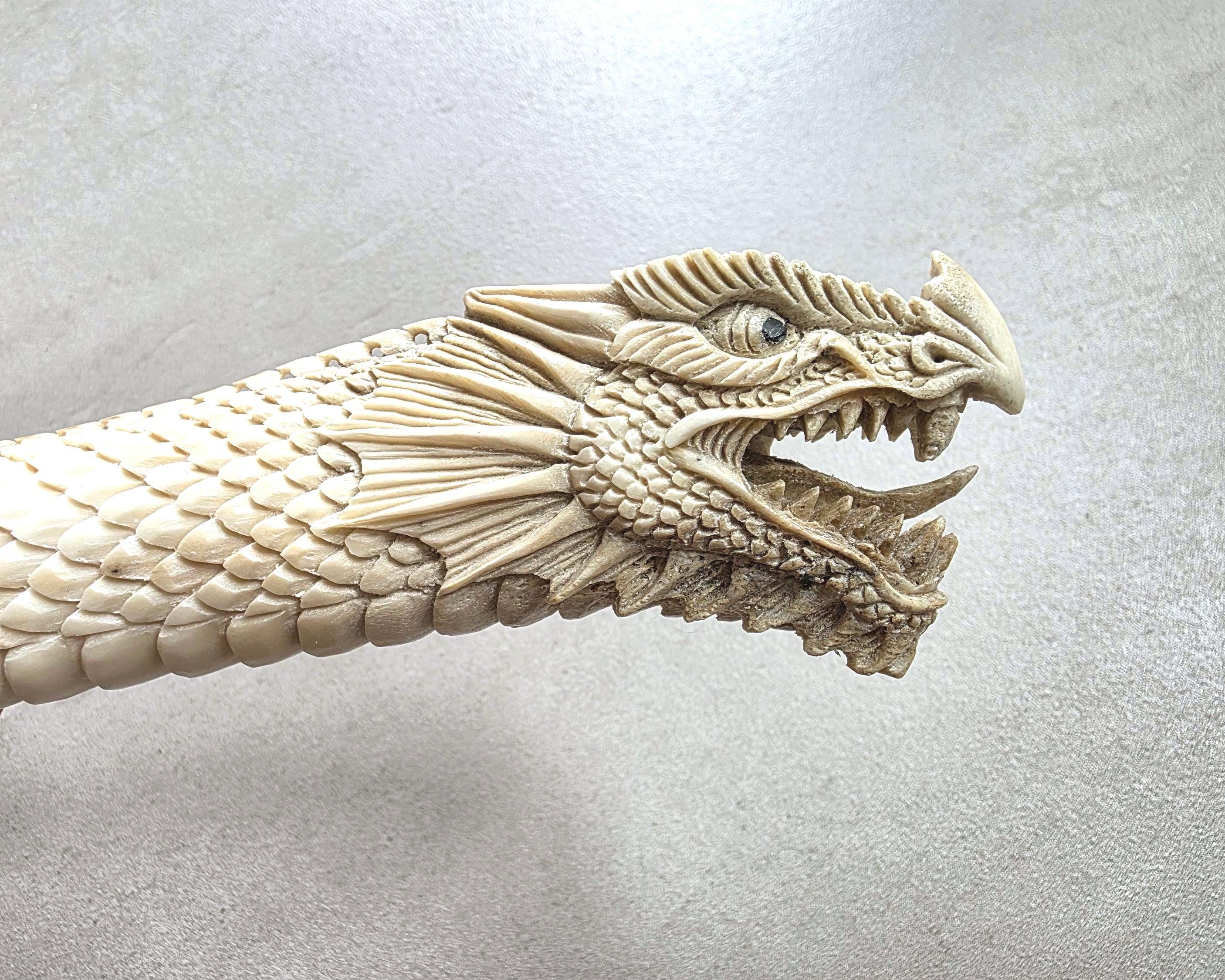 The natural ivory tone of the antler enhances every carved detail, creating depth and contrast across the dragon’s scales and face.