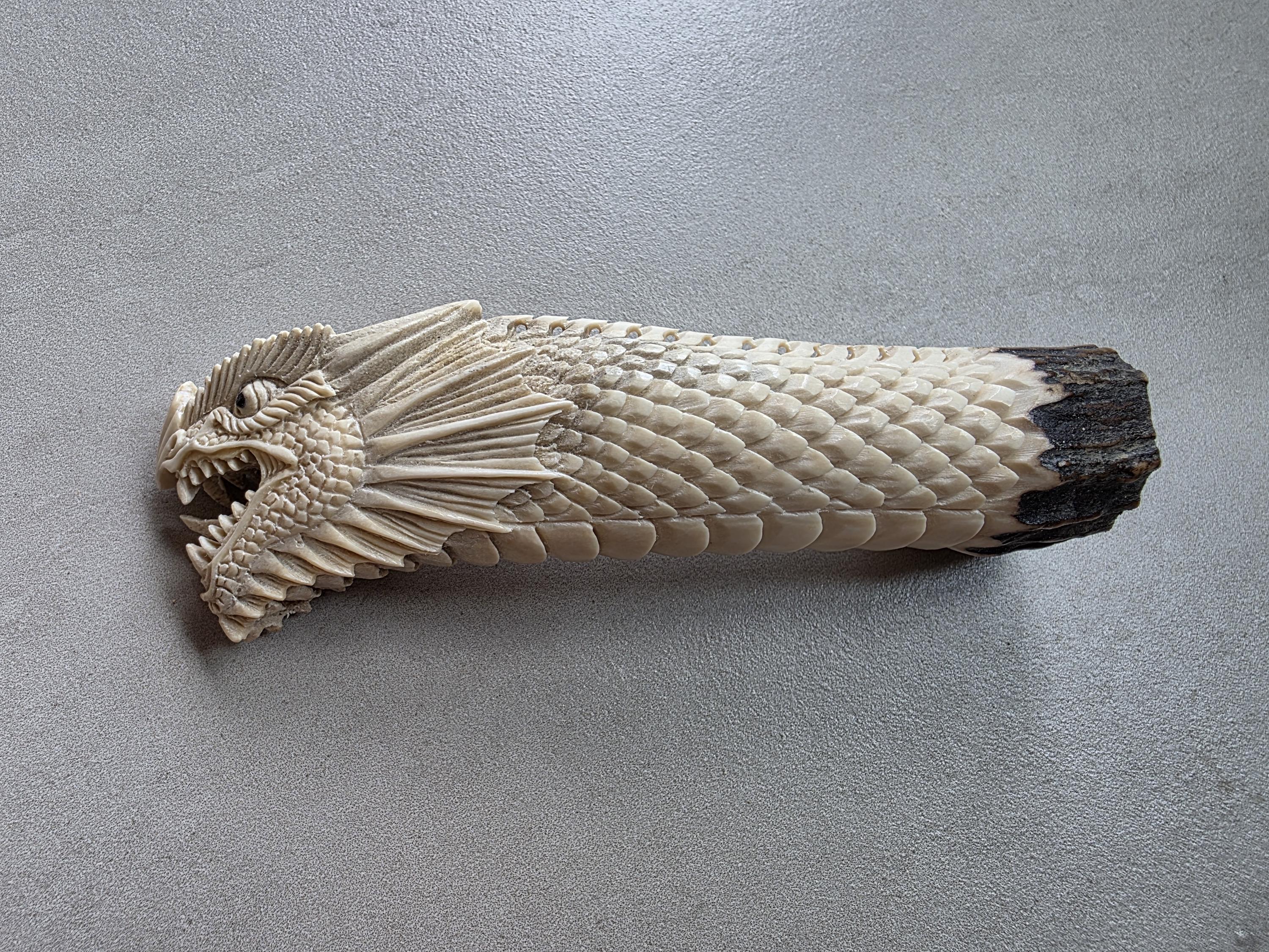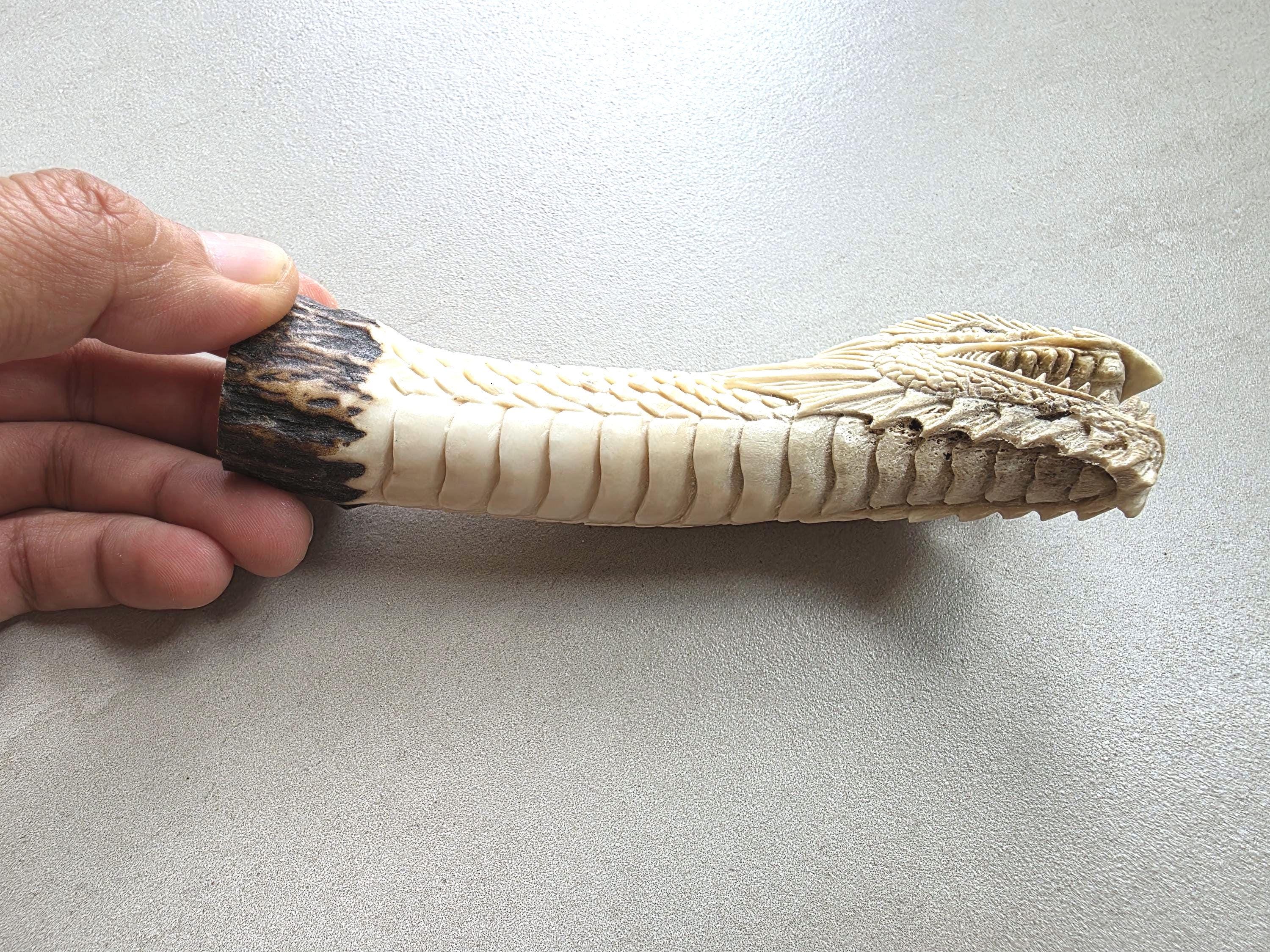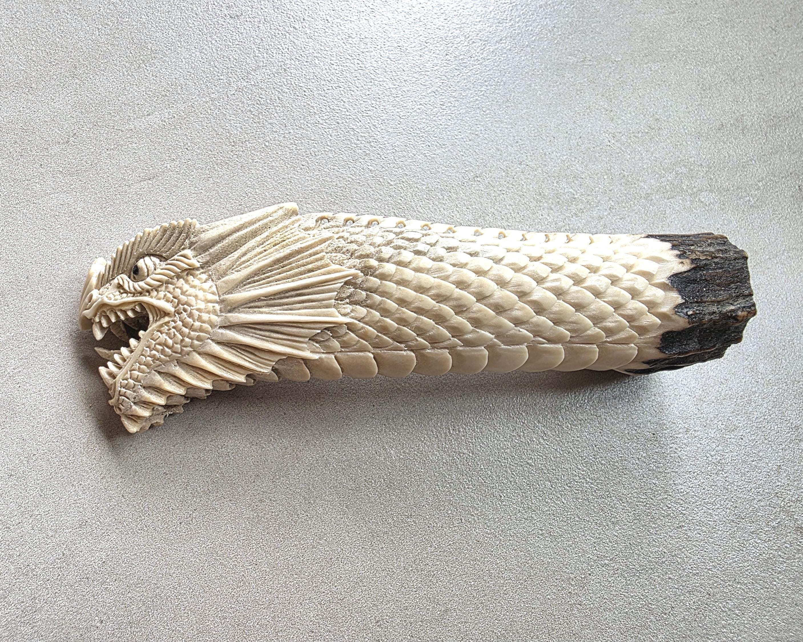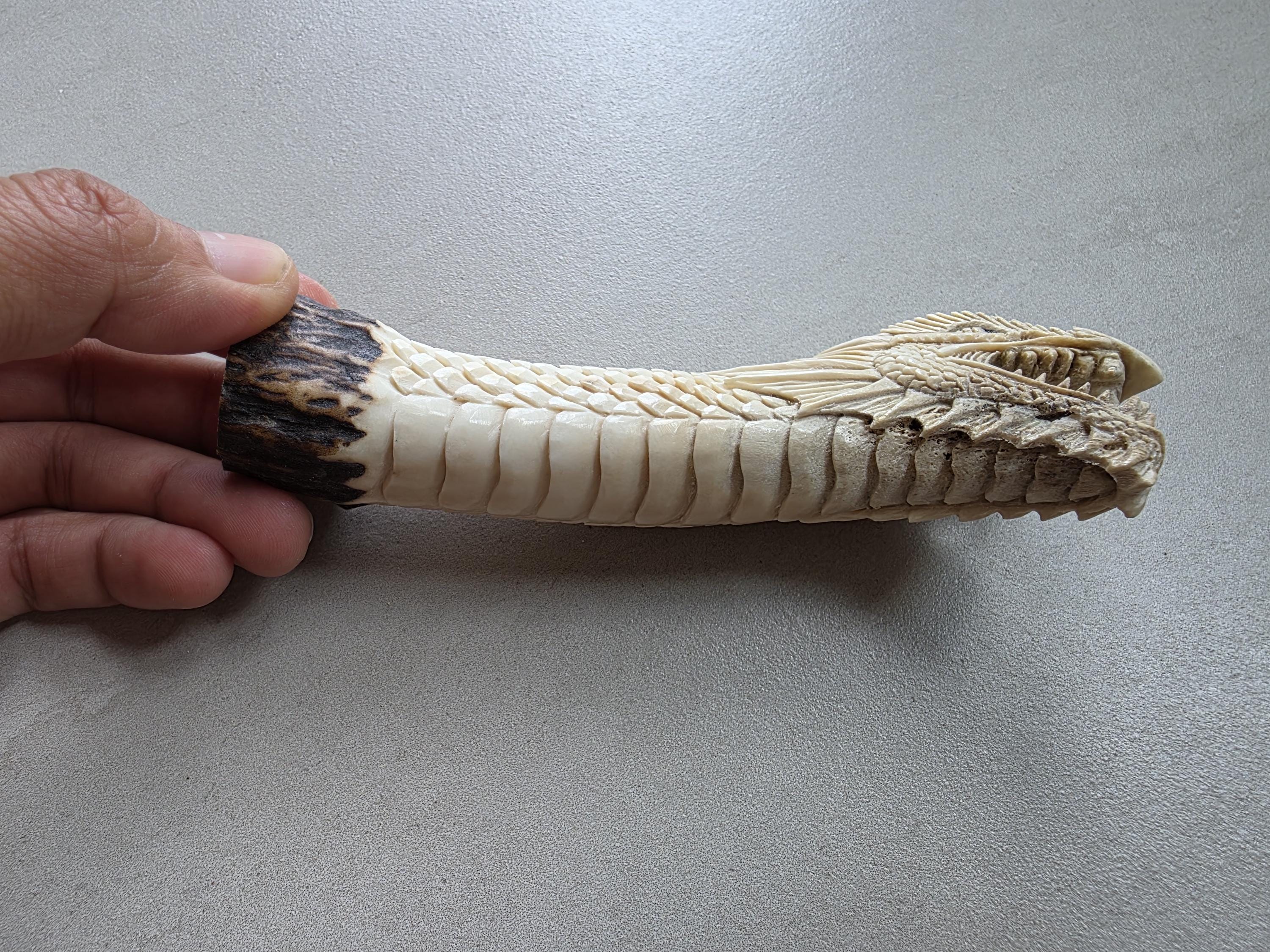 The natural ivory tone of the antler enhances every carved detail, creating depth and contrast across the dragon’s scales and face.