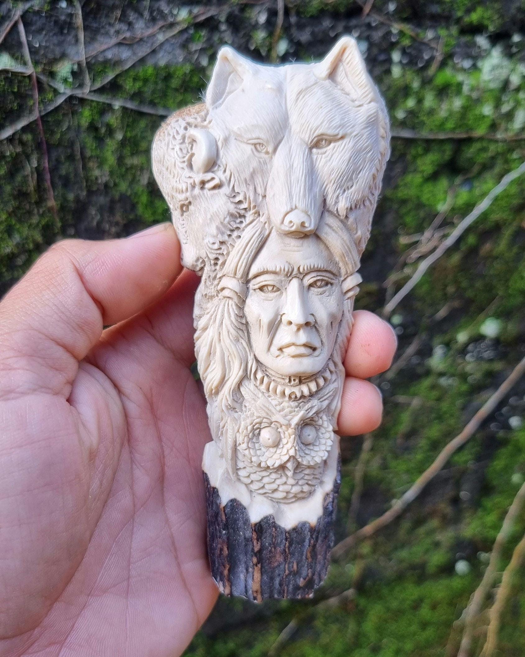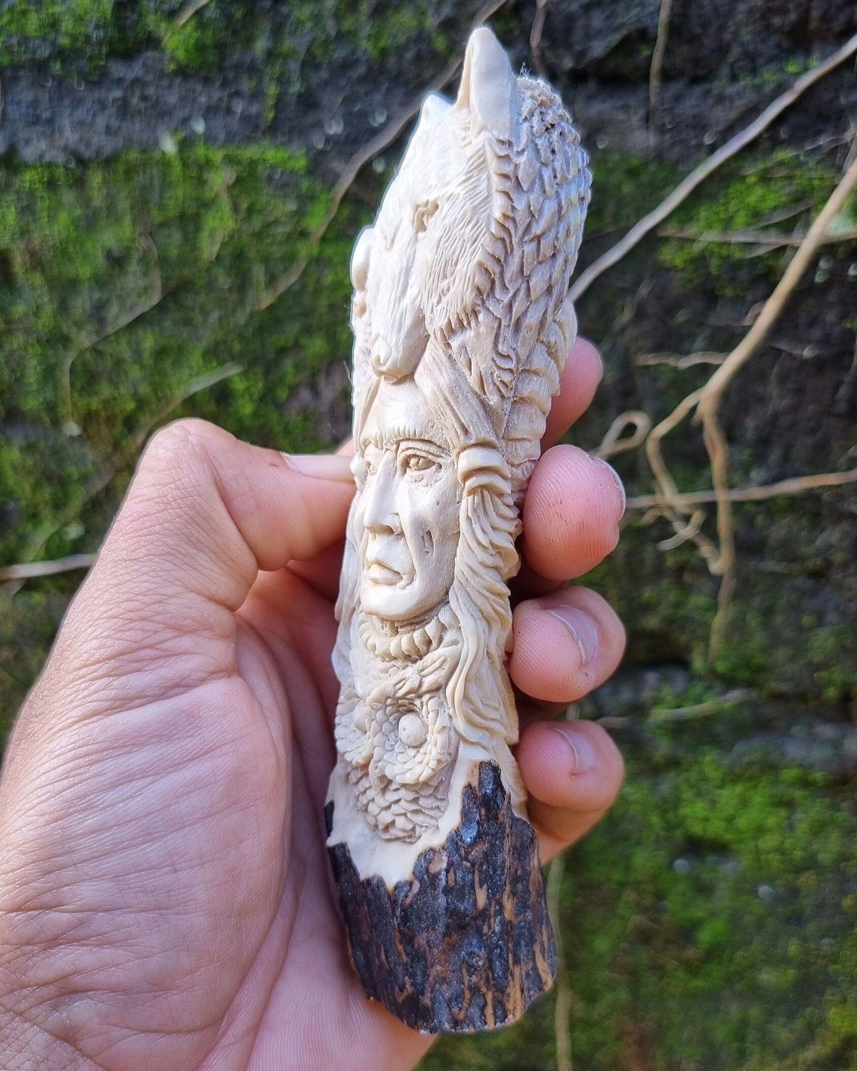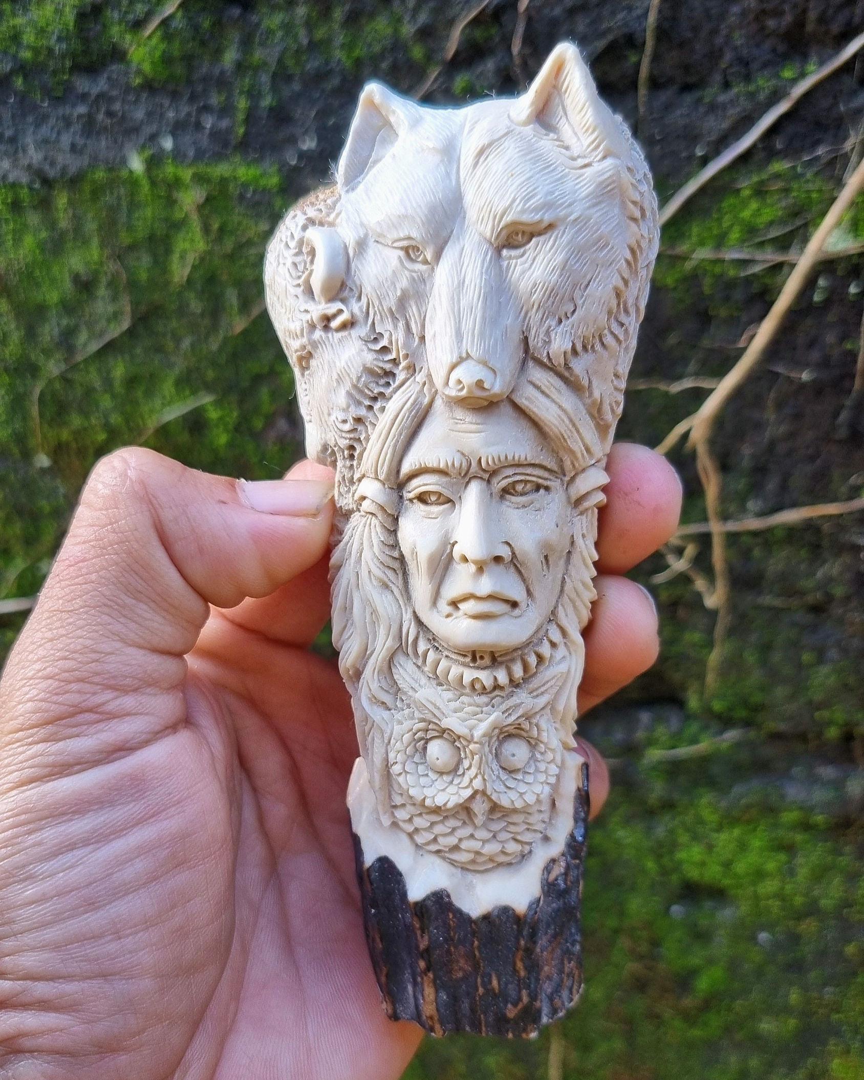A stunning hand-carved knife handle made from genuine deer antler, featuring exquisite wildlife and spirit motifs.