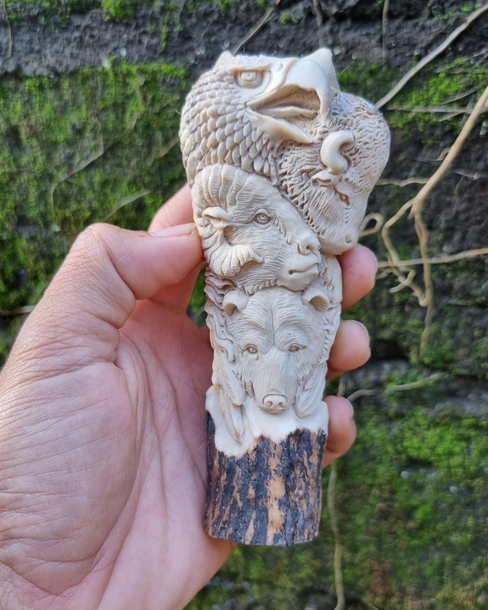 Front Side: Intricate carvings of eagle, ram, and bear – symbols of strength and courage.