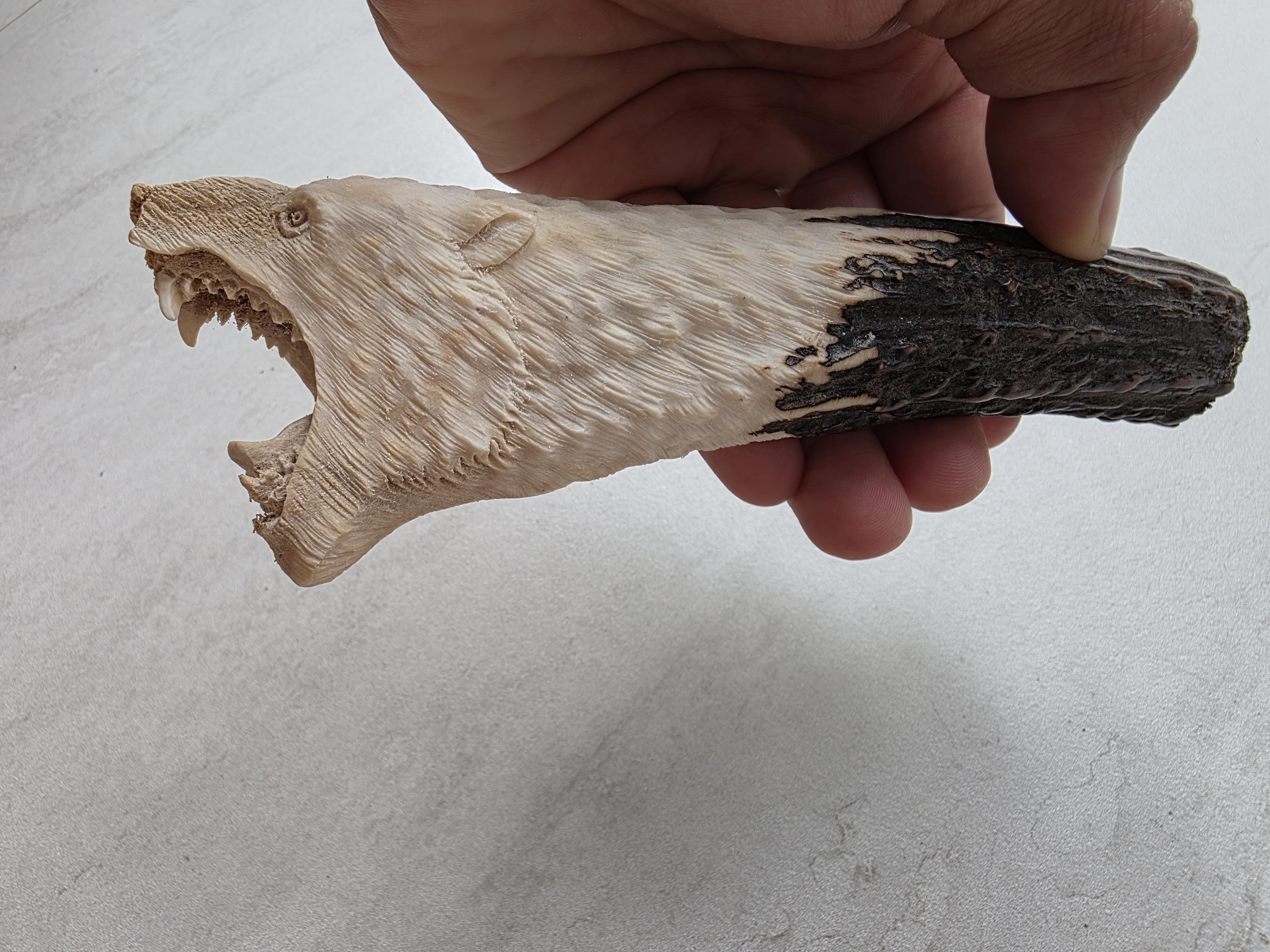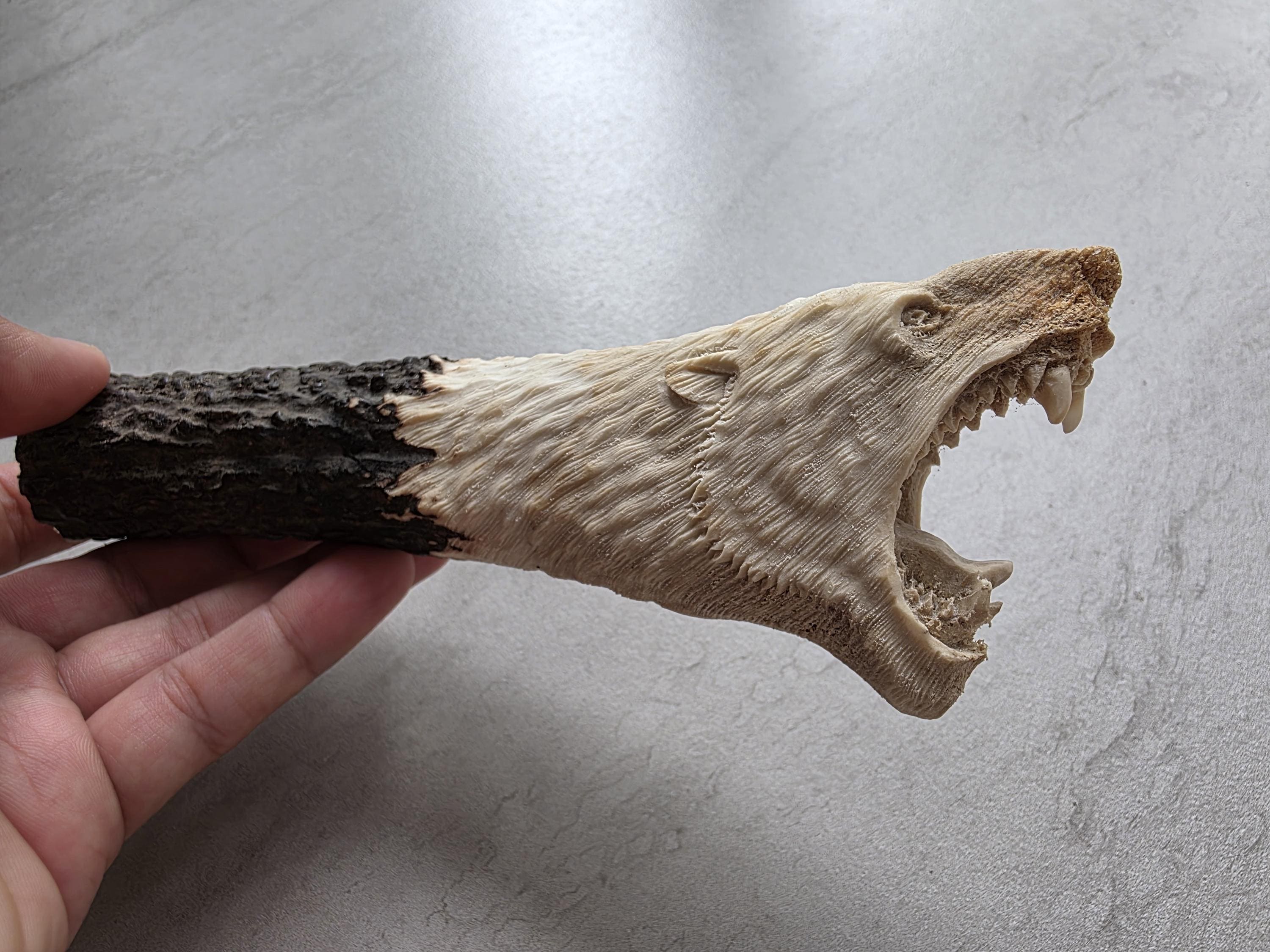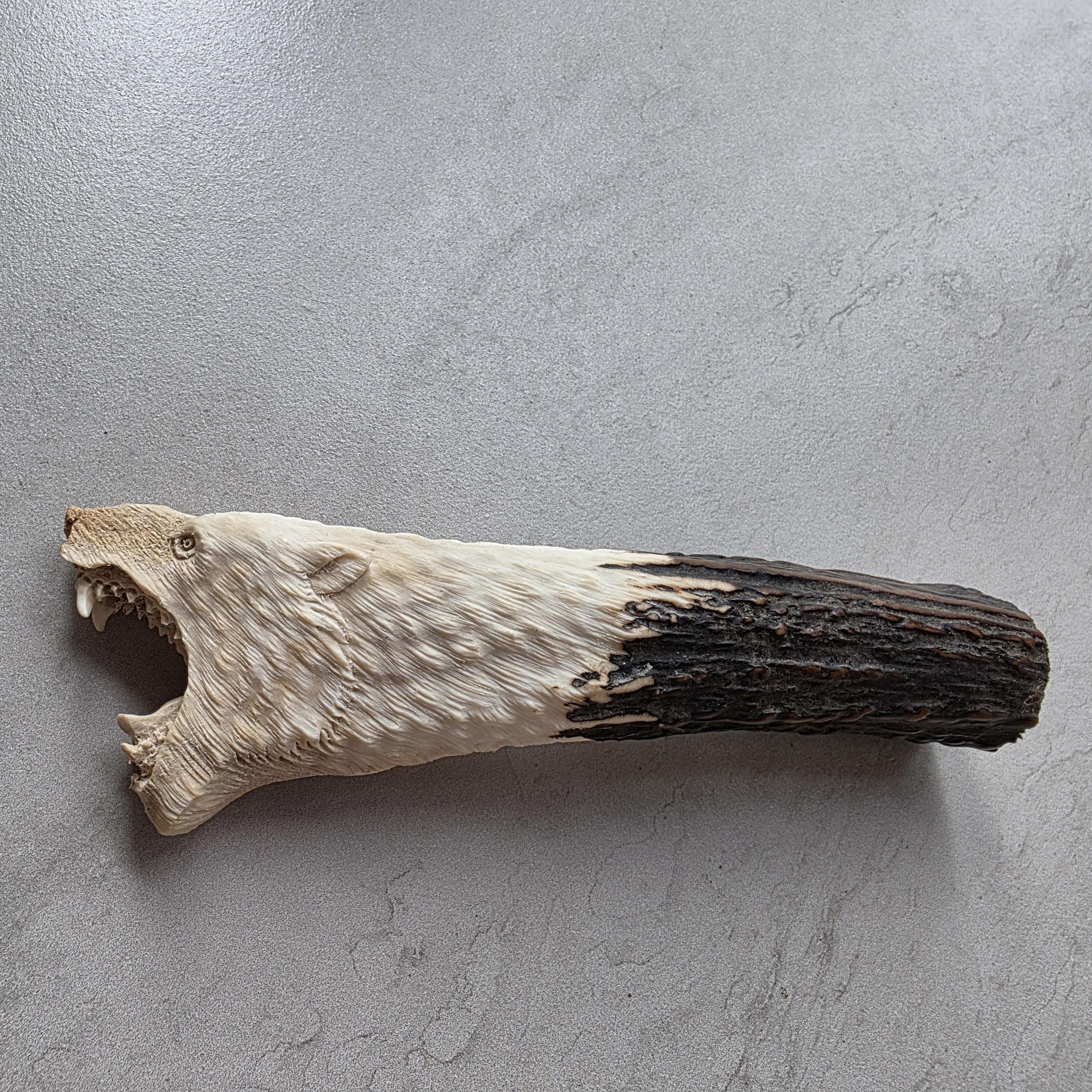 Add a rustic and wild touch to your custom knife project with this hand-carved knife handle made from 100% genuine deer antler. This unique piece features a detailed bear head carving, showcasing masterful craftsmanship and the natural beauty of real antler.