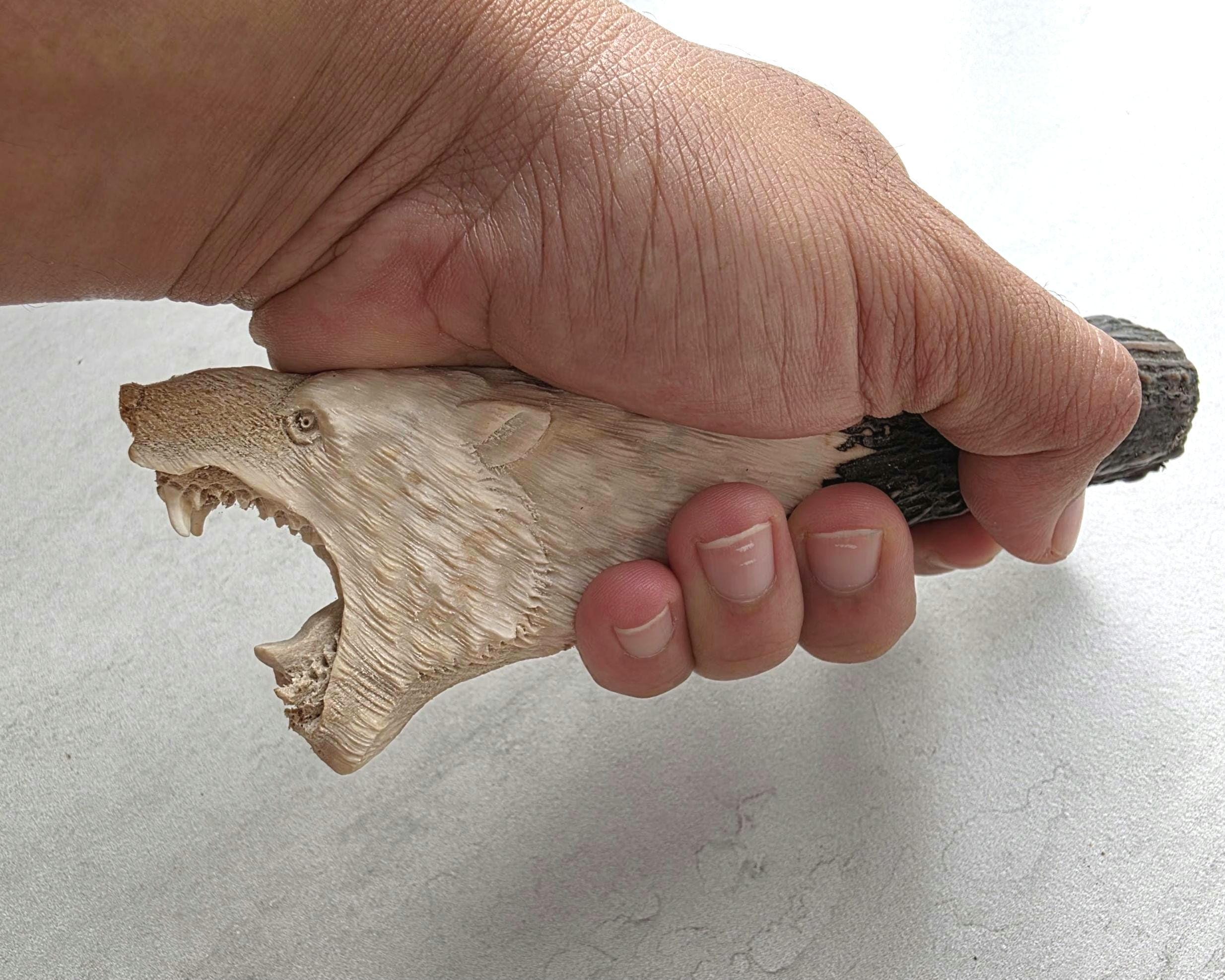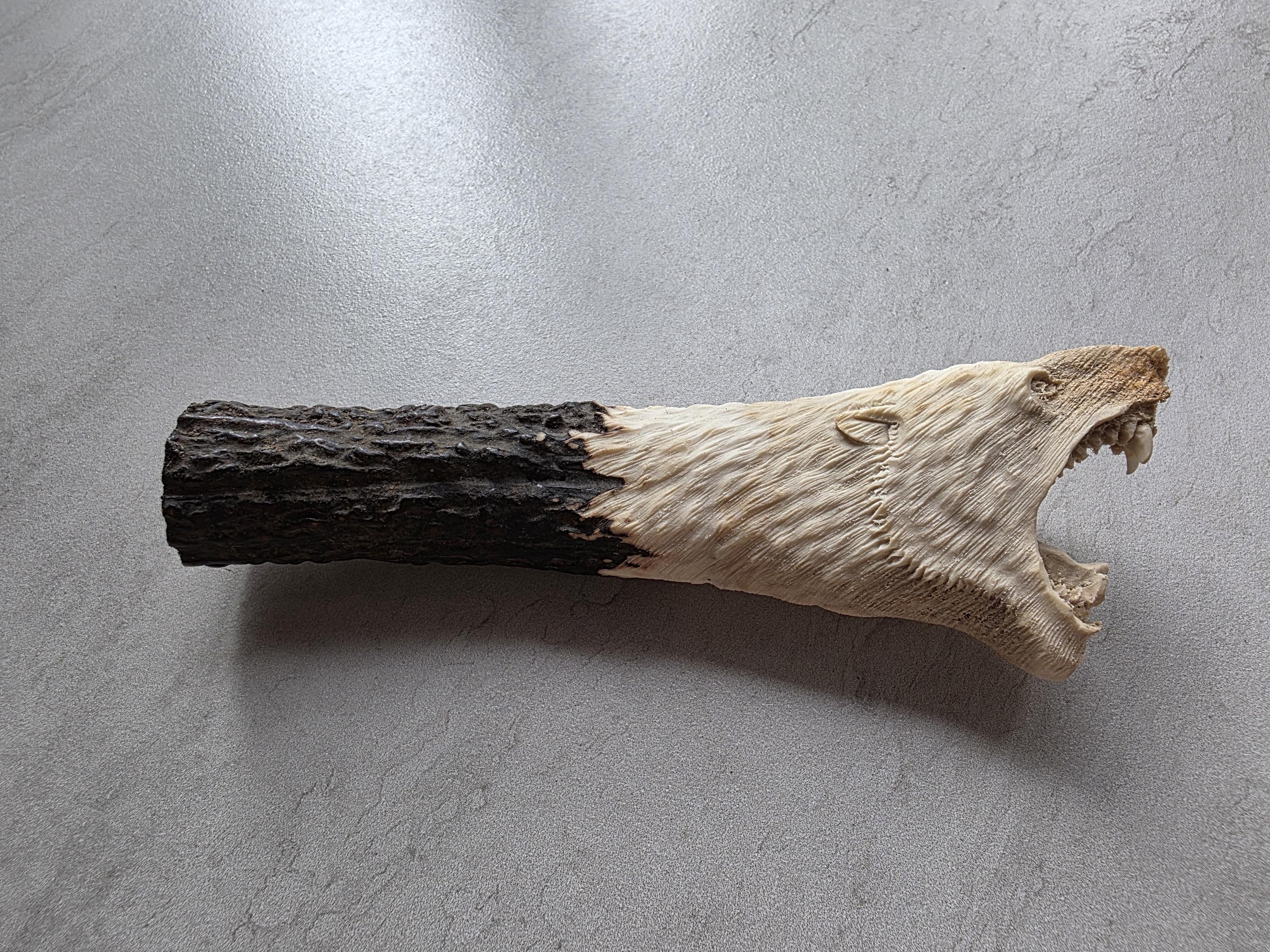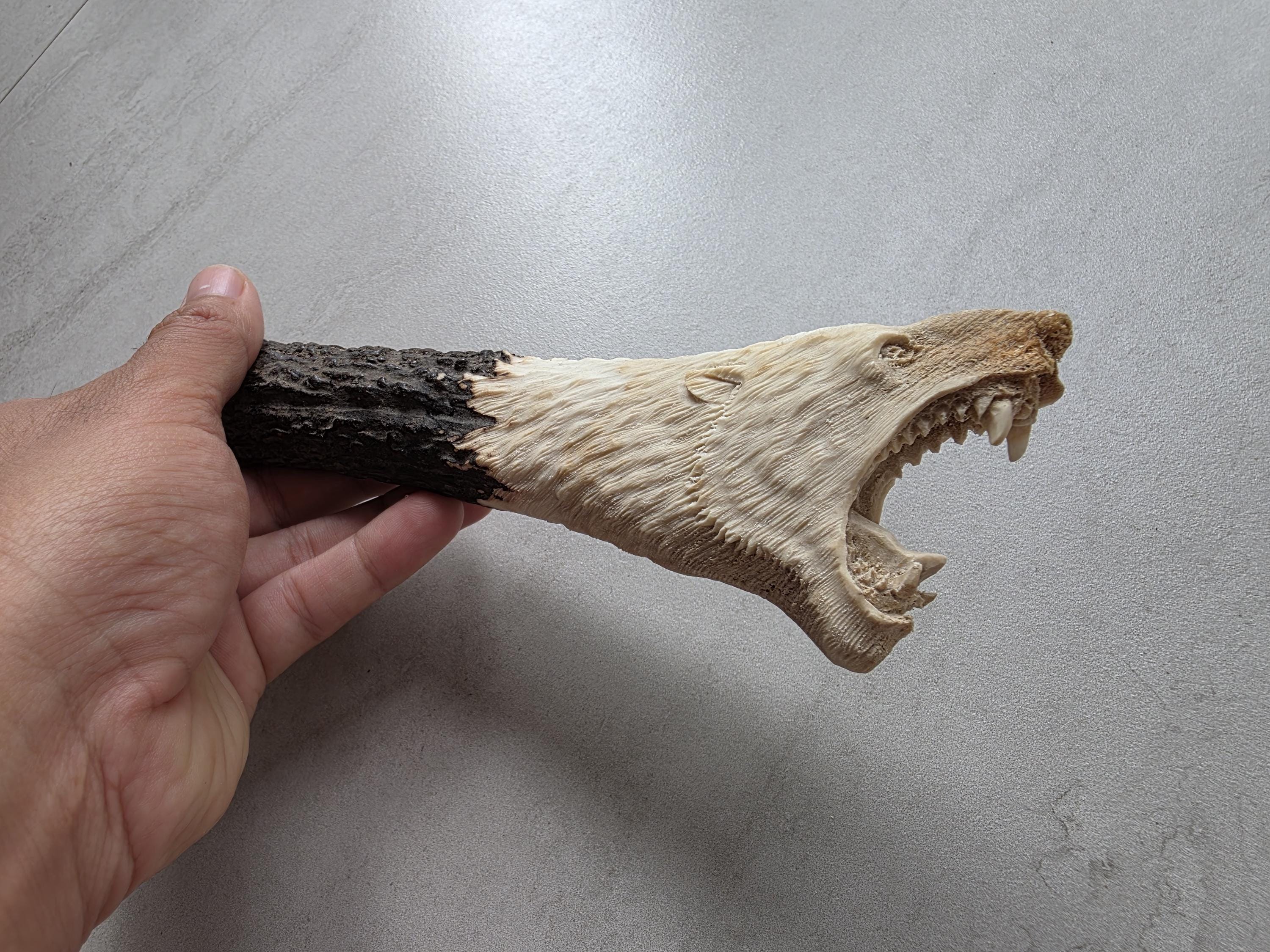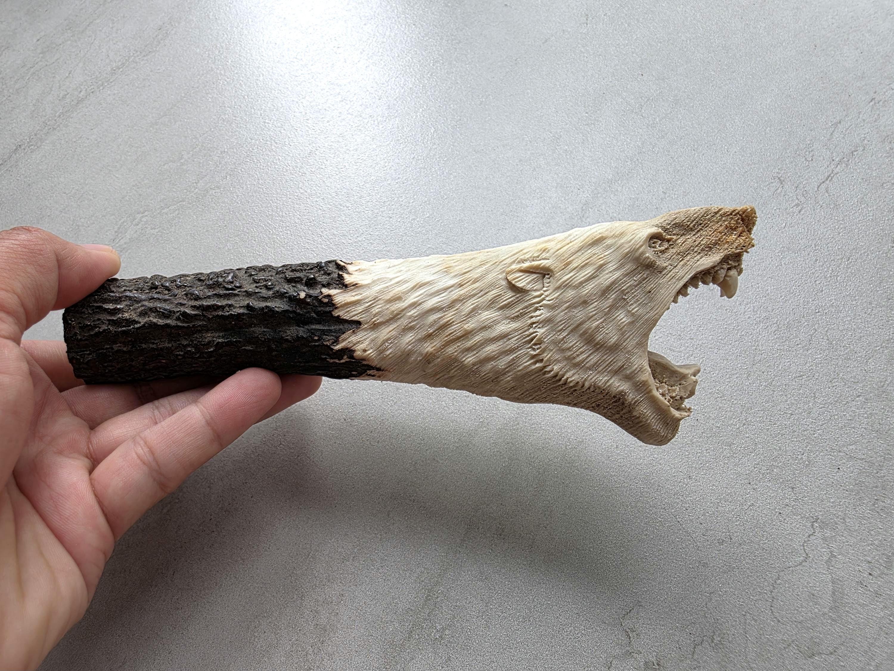 Add a rustic and wild touch to your custom knife project with this hand-carved knife handle made from 100% genuine deer antler. This unique piece features a detailed bear head carving, showcasing masterful craftsmanship and the natural beauty of real antler.