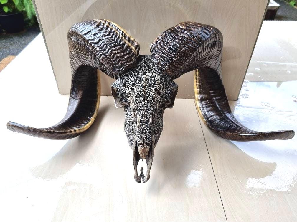 Material:Natural ram sheep skull clean after boiling with peroxide and skull colour white clean dray no smell before carving