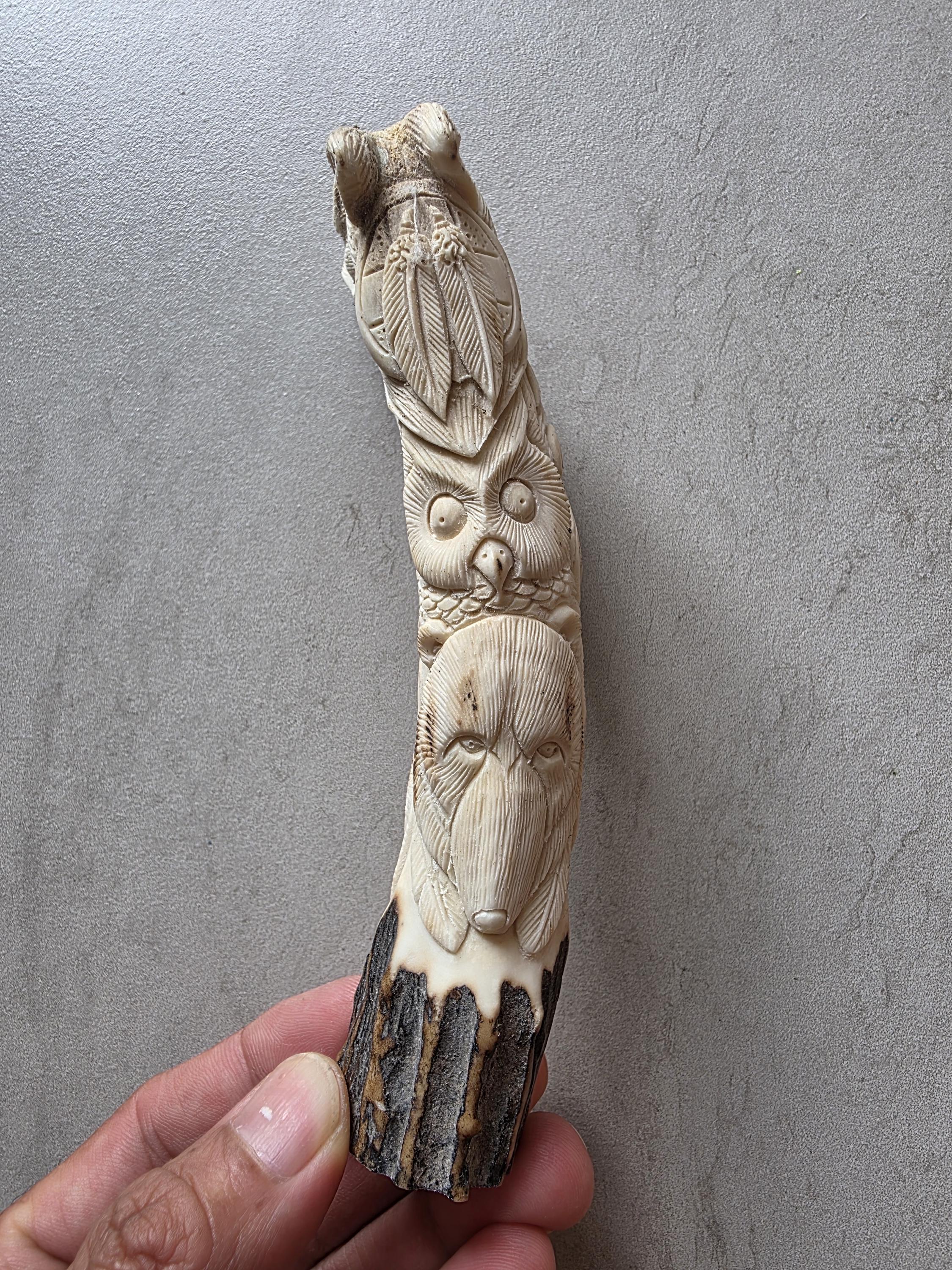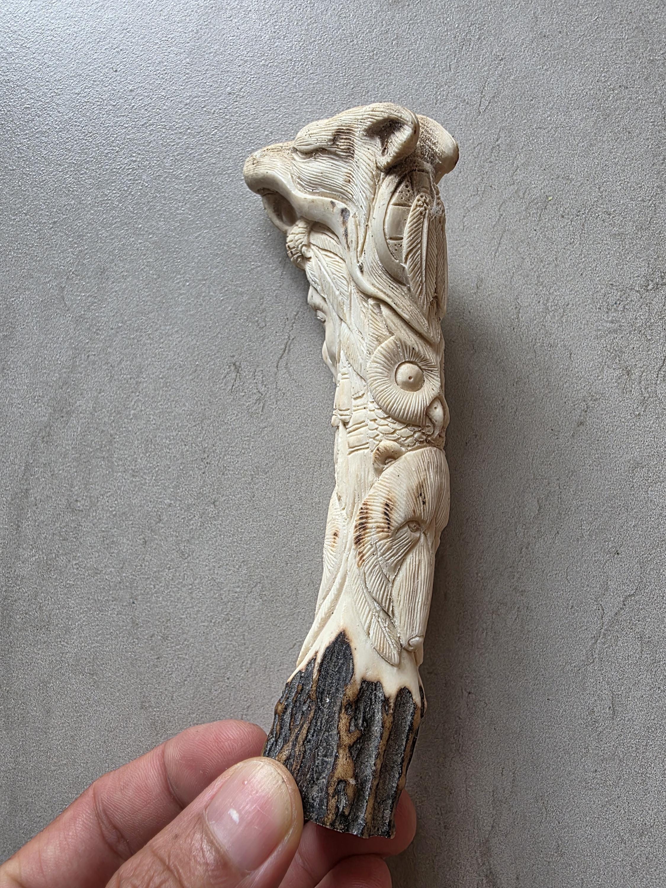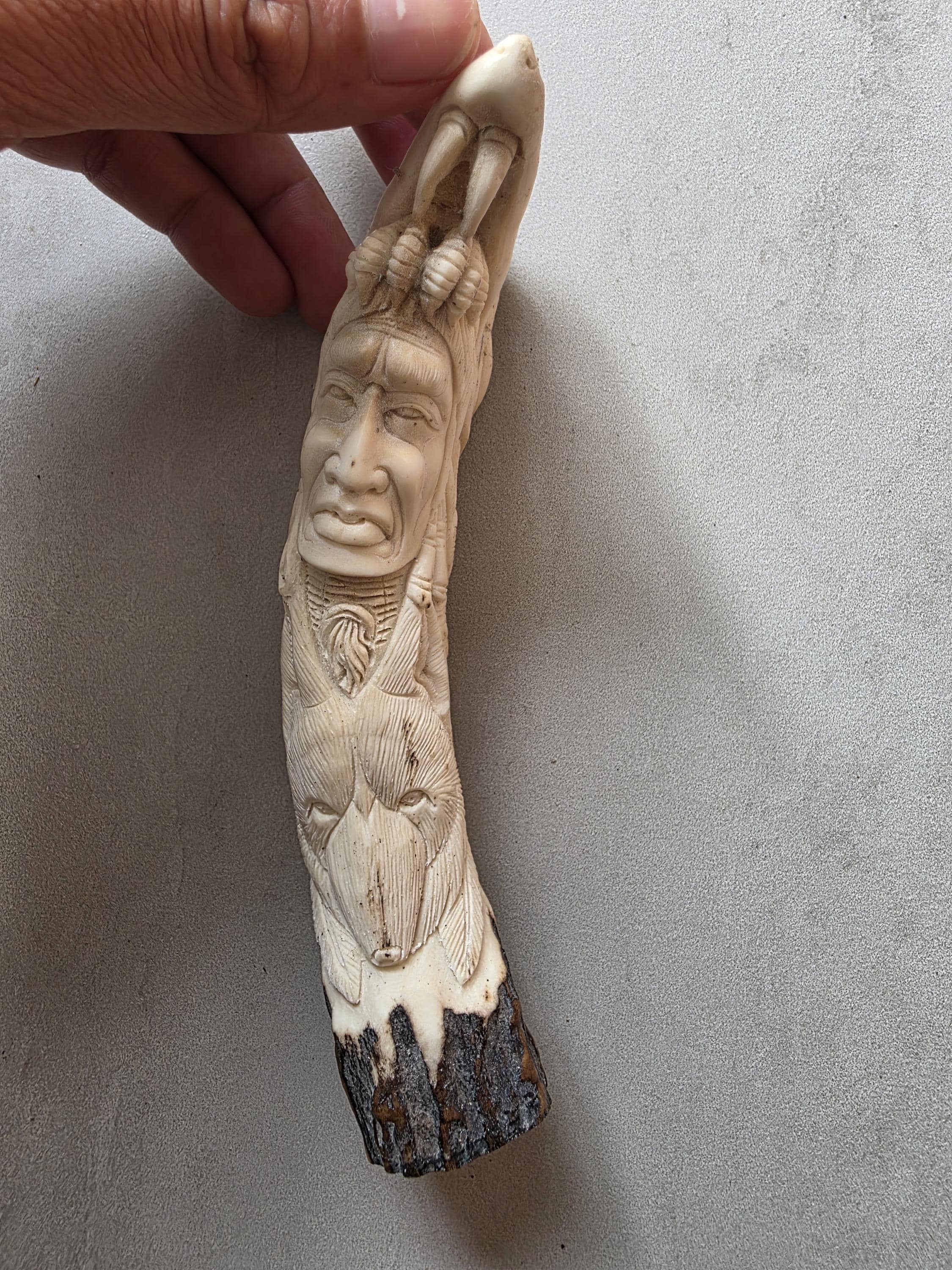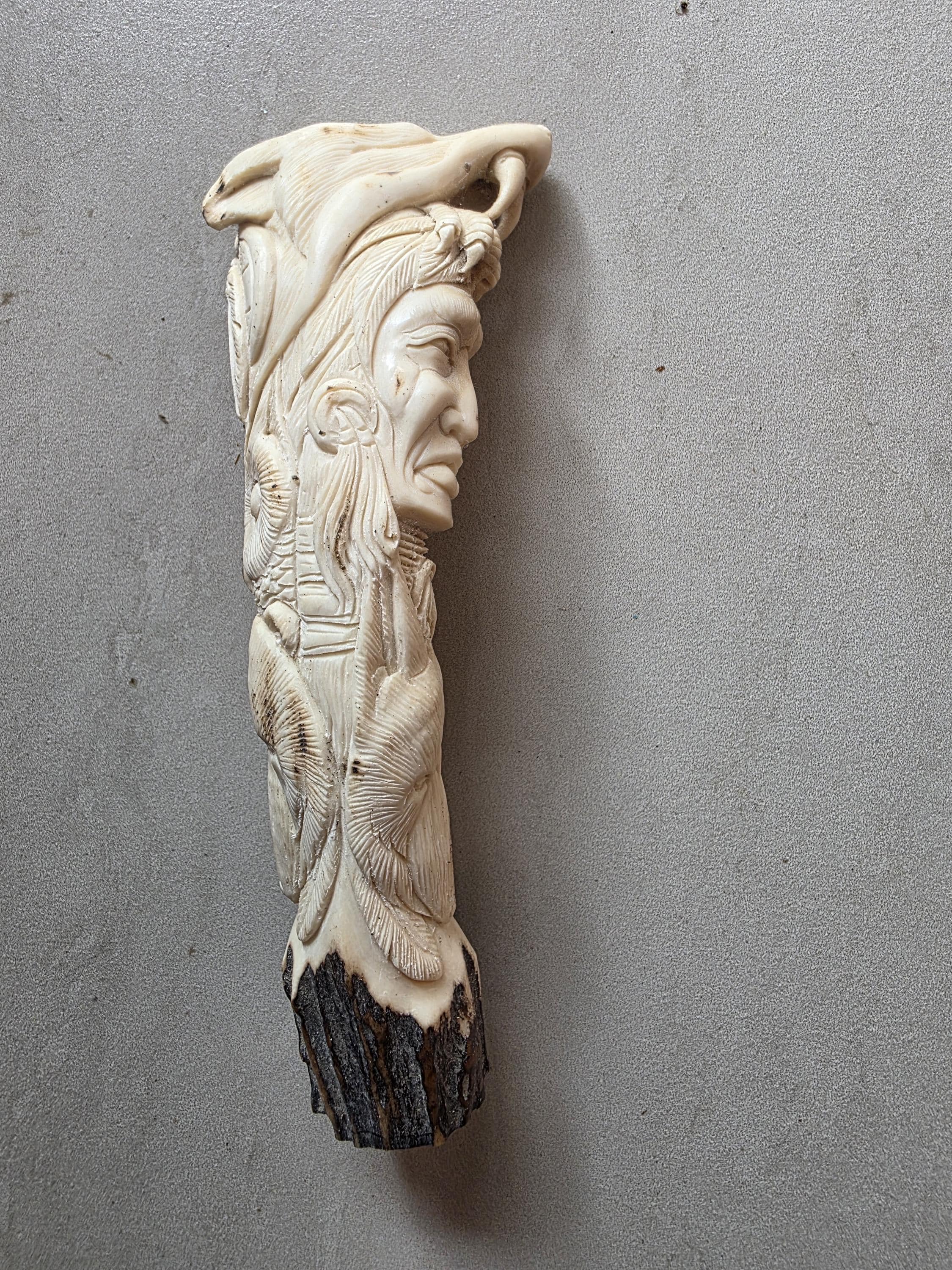 This piece is a hand carved bone handle, featuring a detailed tribal warrior figure with strong facial expression and flowing carved textures.