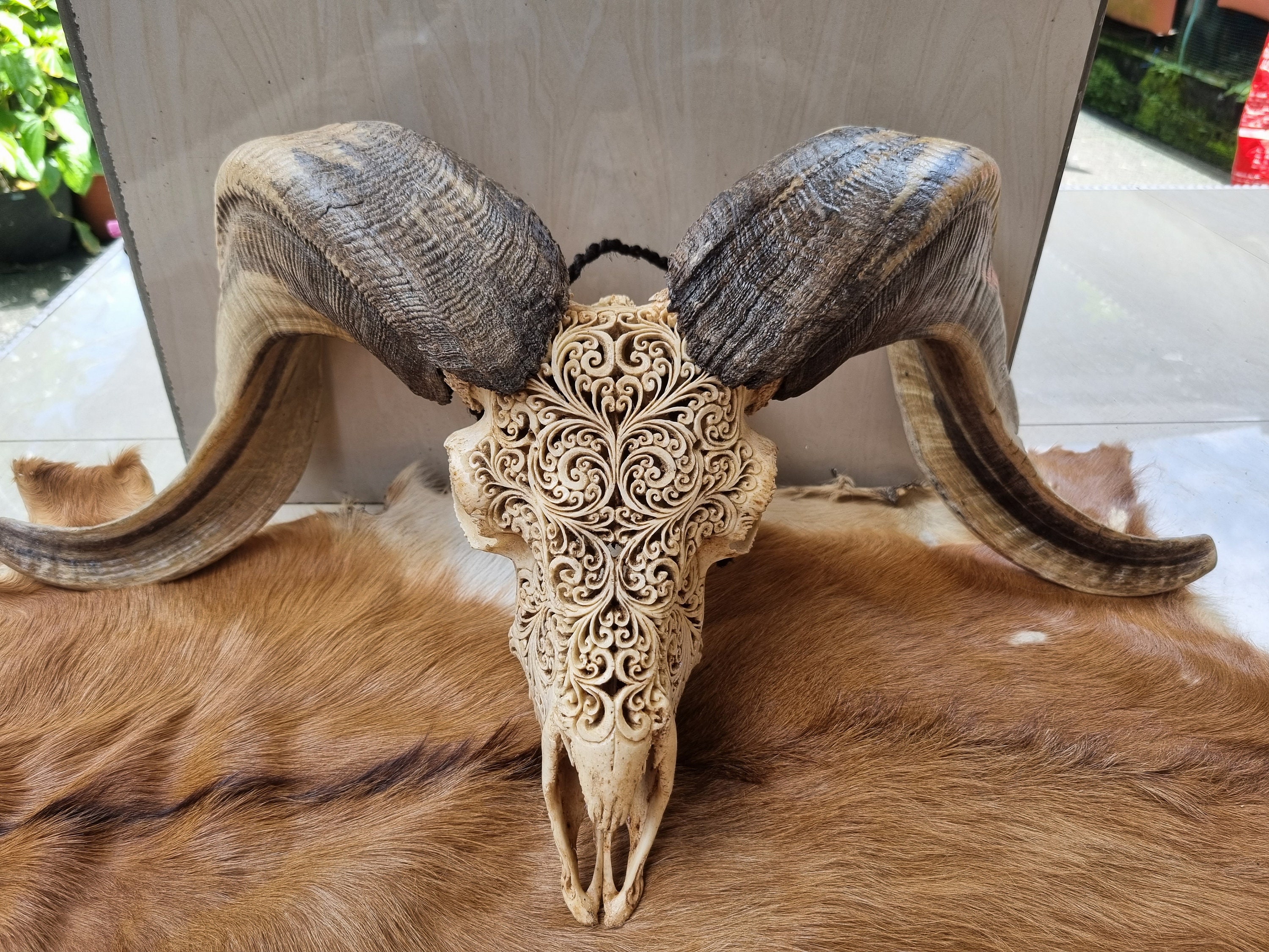 This listing features a large, hand-carved ram skull, decorated with deep ornamental tribal patterns carved directly into the bone surface.