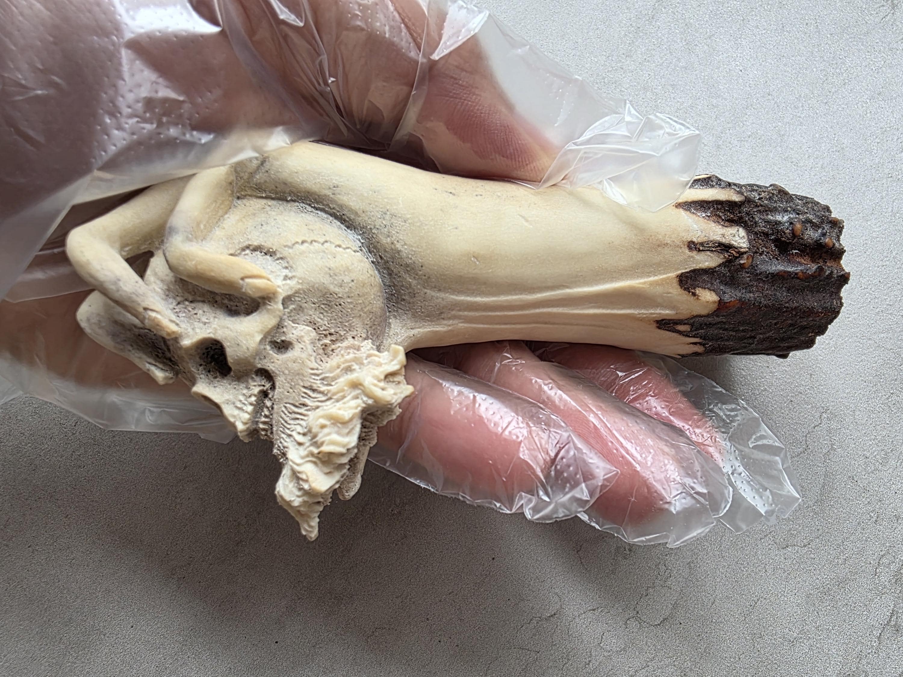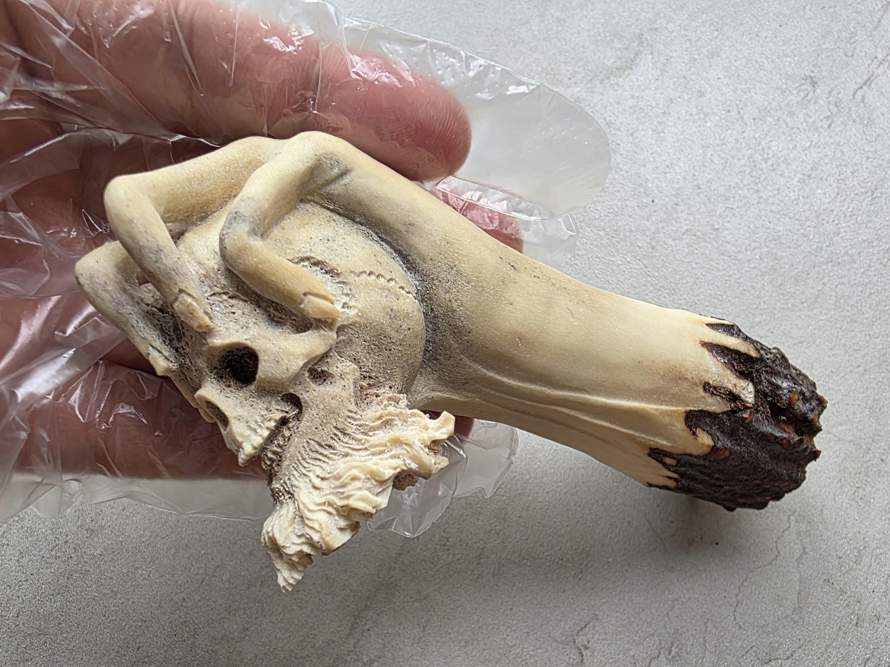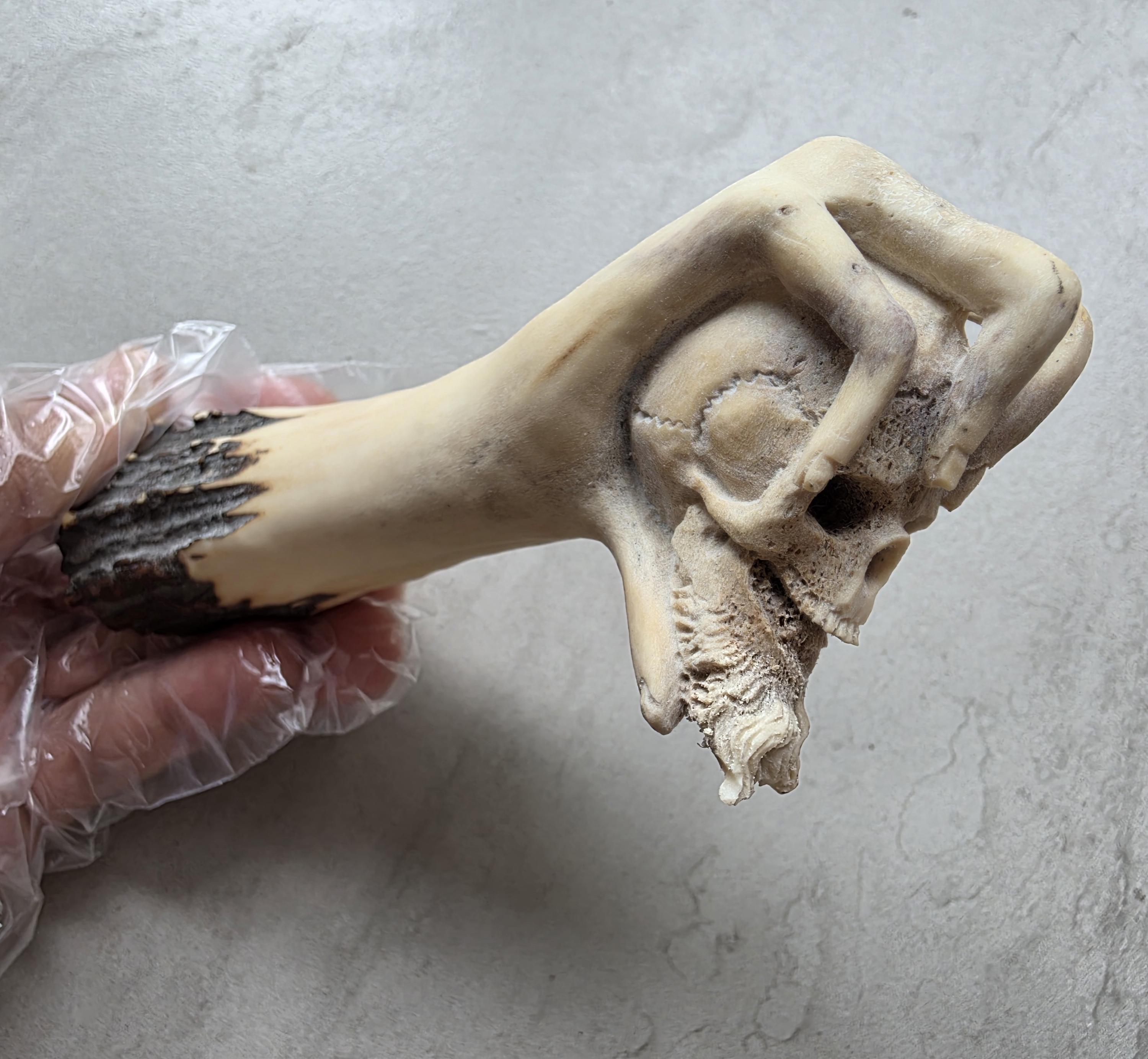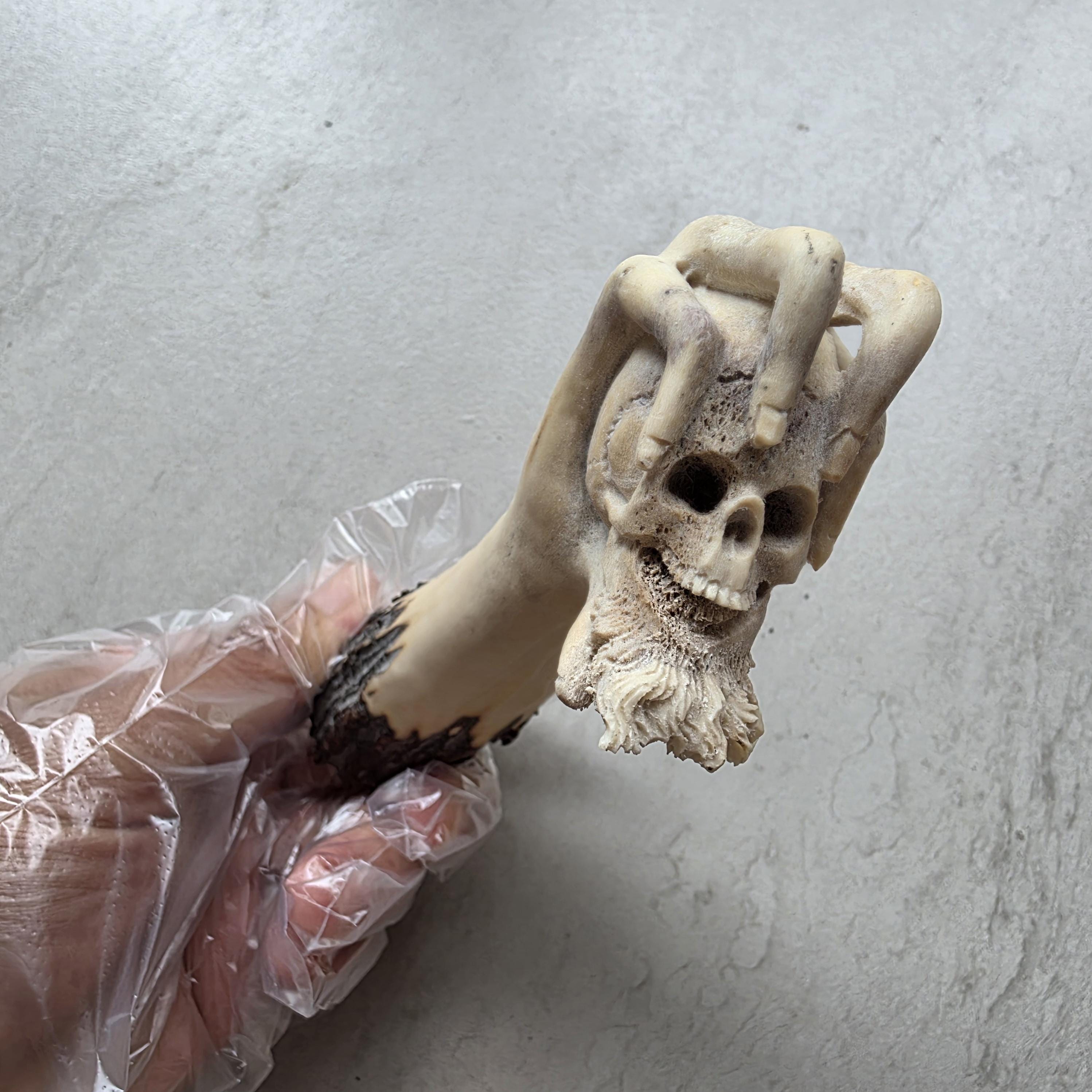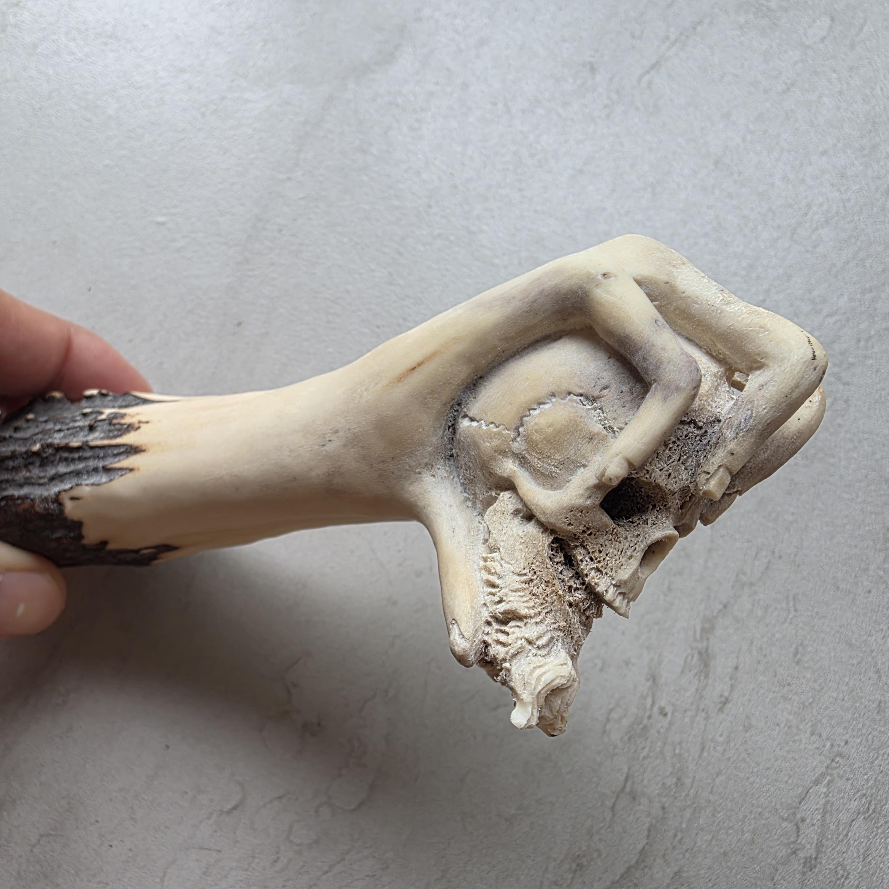 This one-of-a-kind piece is carefully hand-carved from genuine deer antler, featuring an intricate design of a human skull being held by a detailed hand. A stunning example of traditional bone and horn craftsmanship, this artwork combines natural materials with symbolic artistry, making it perfect for collectors and enthusiasts of gothic, tribal, or boho decor.