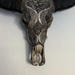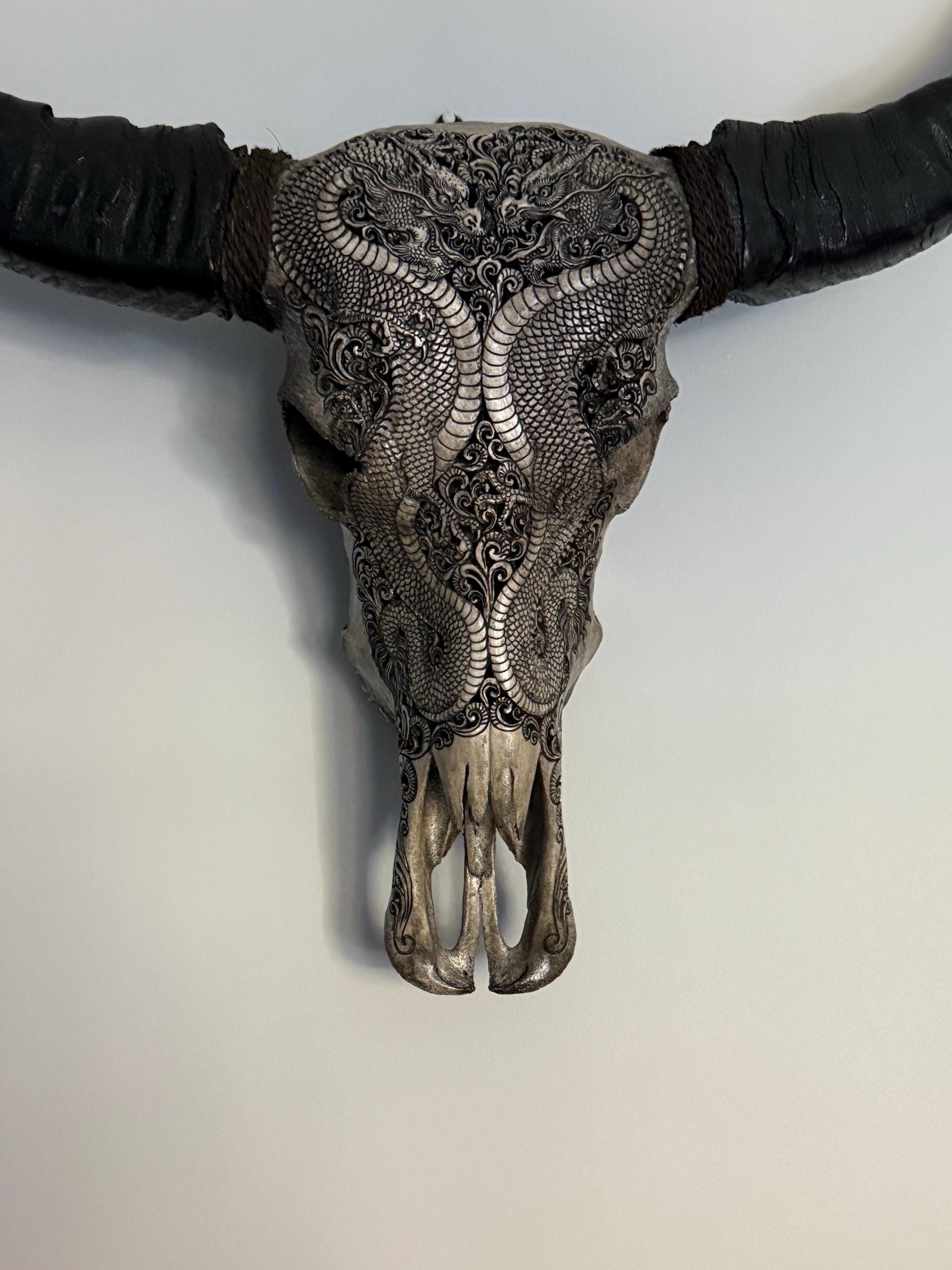 This is a carved buffalo skull with horns attached original . The skull has been intricately engraved with ornamental designs, including floral and possibly dragon or mythical motifs. These kinds of carvings are often created for decorative purposes and are popular in interior design, especially in rustic, bohemian, or tribal-themed decor. The craftsmanship indicates it may have cultural or artistic significance, possibly from regions like Bali or Thailand, where skull carving is a traditional art form.