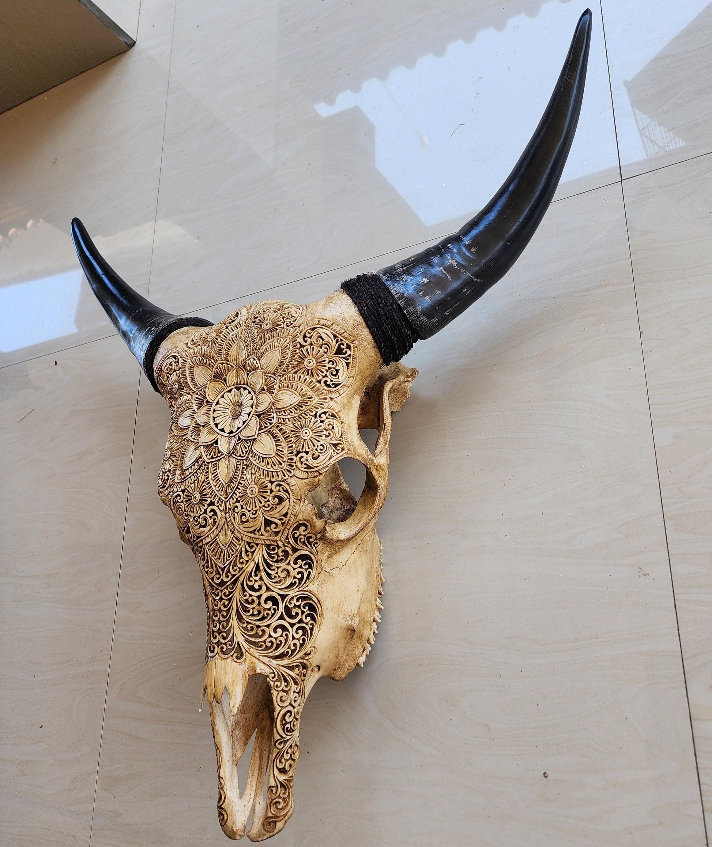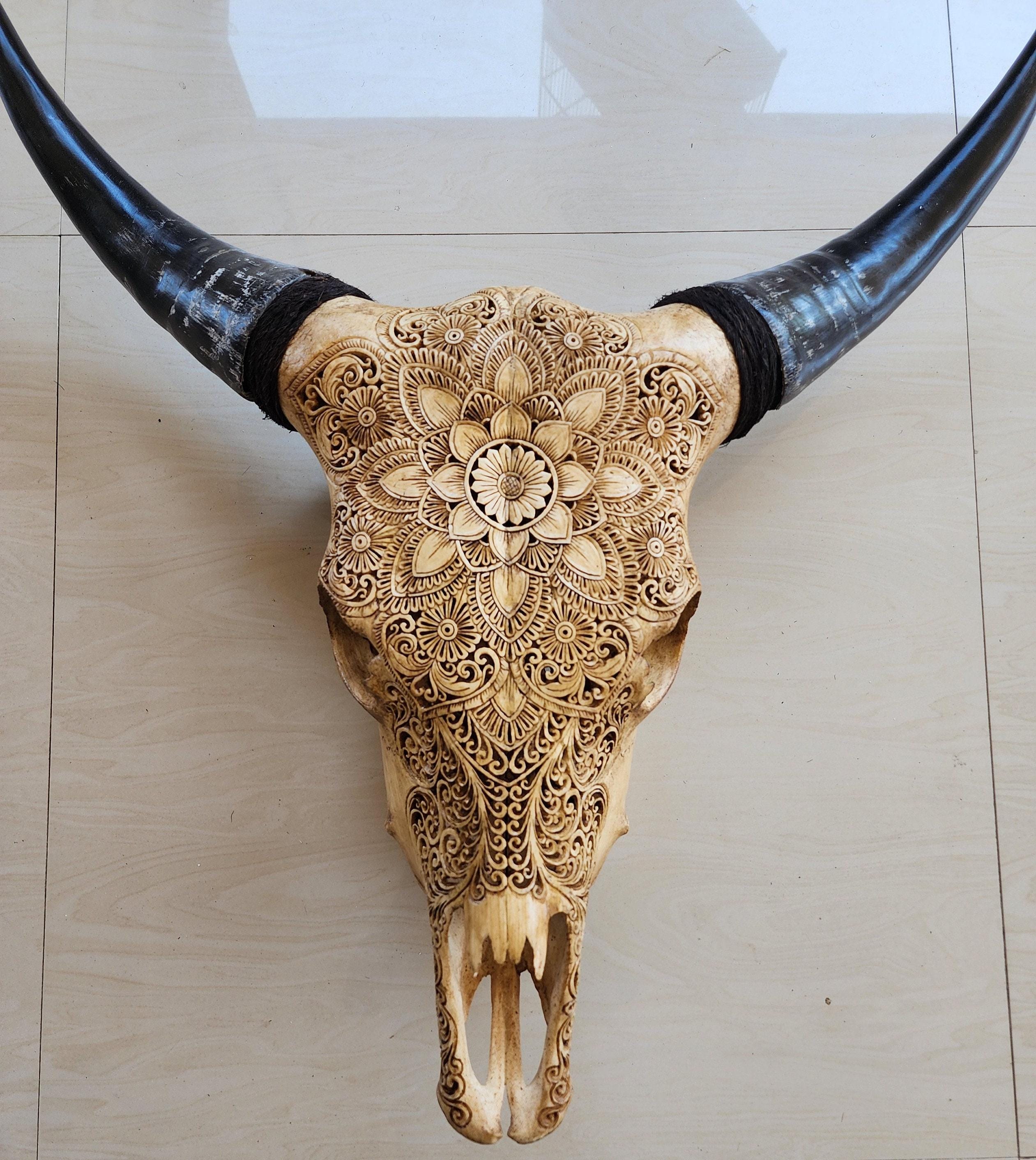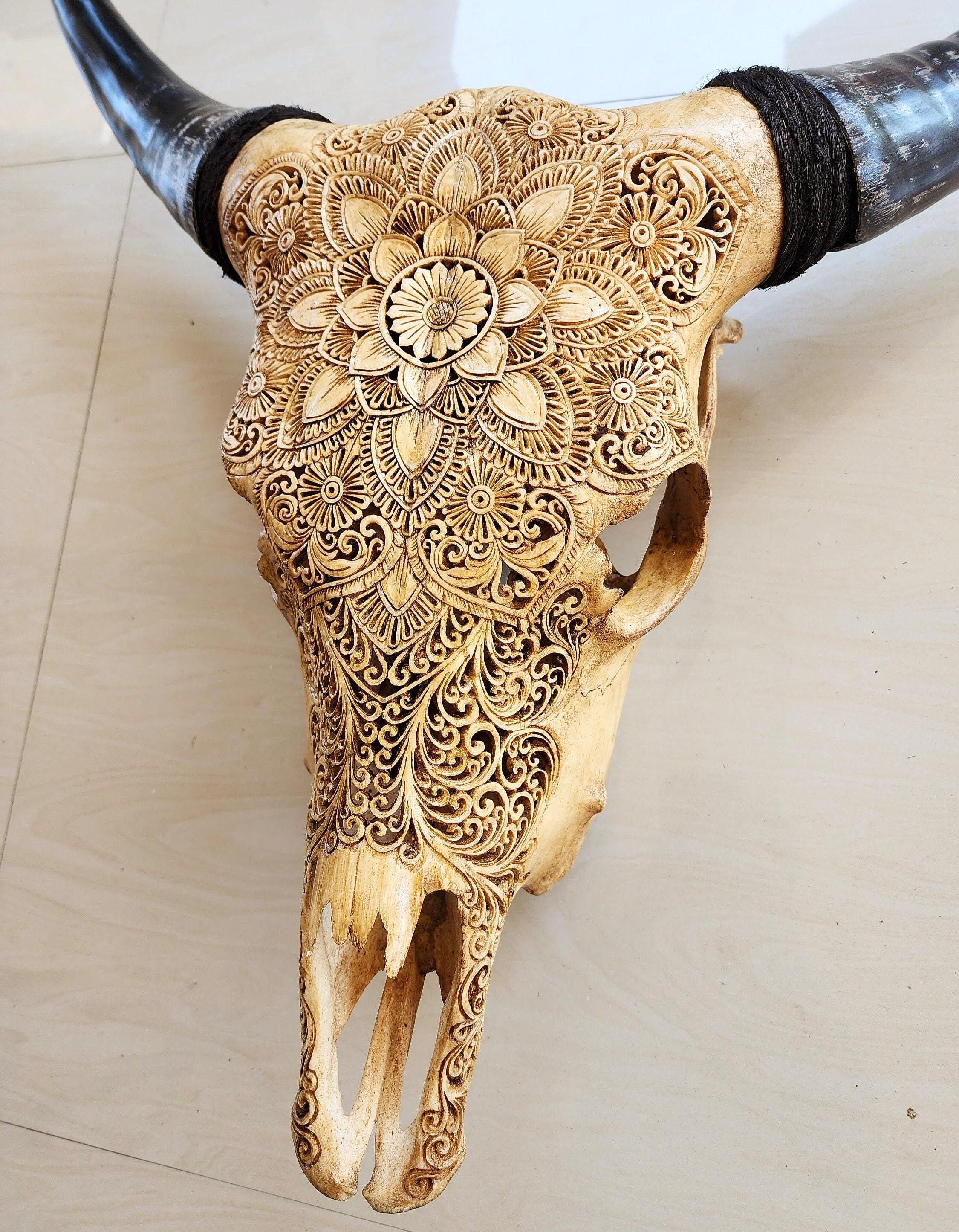 A striking piece of hand-carved real cow skull, featuring an intricate mandala floral design carved entirely by hand by Balinese artisans.