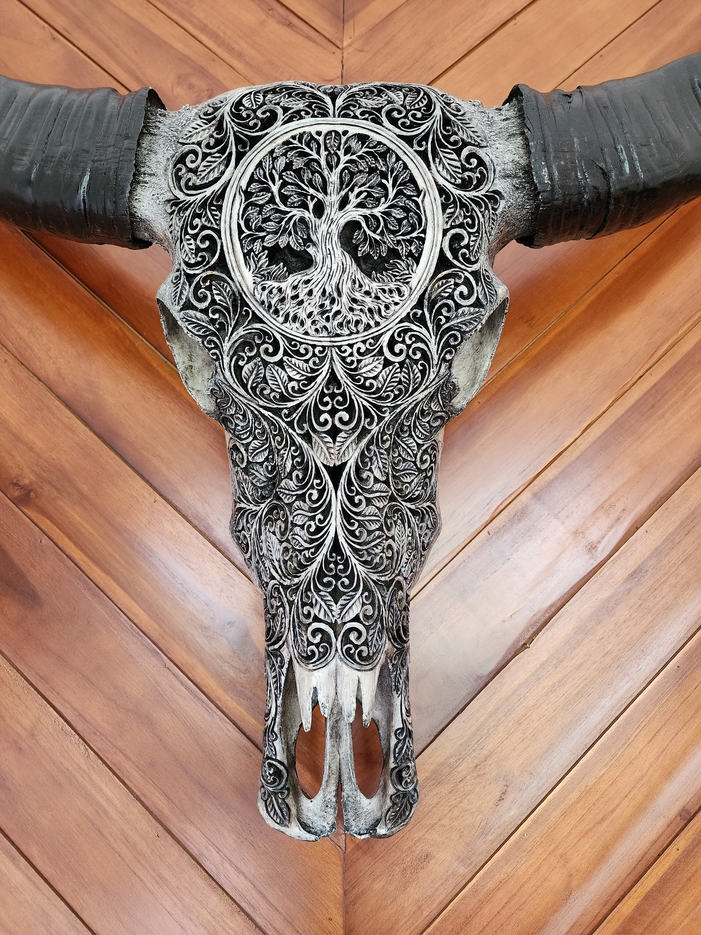 π Hand-Carved Buffalo Skull β Tree of Life Gray
