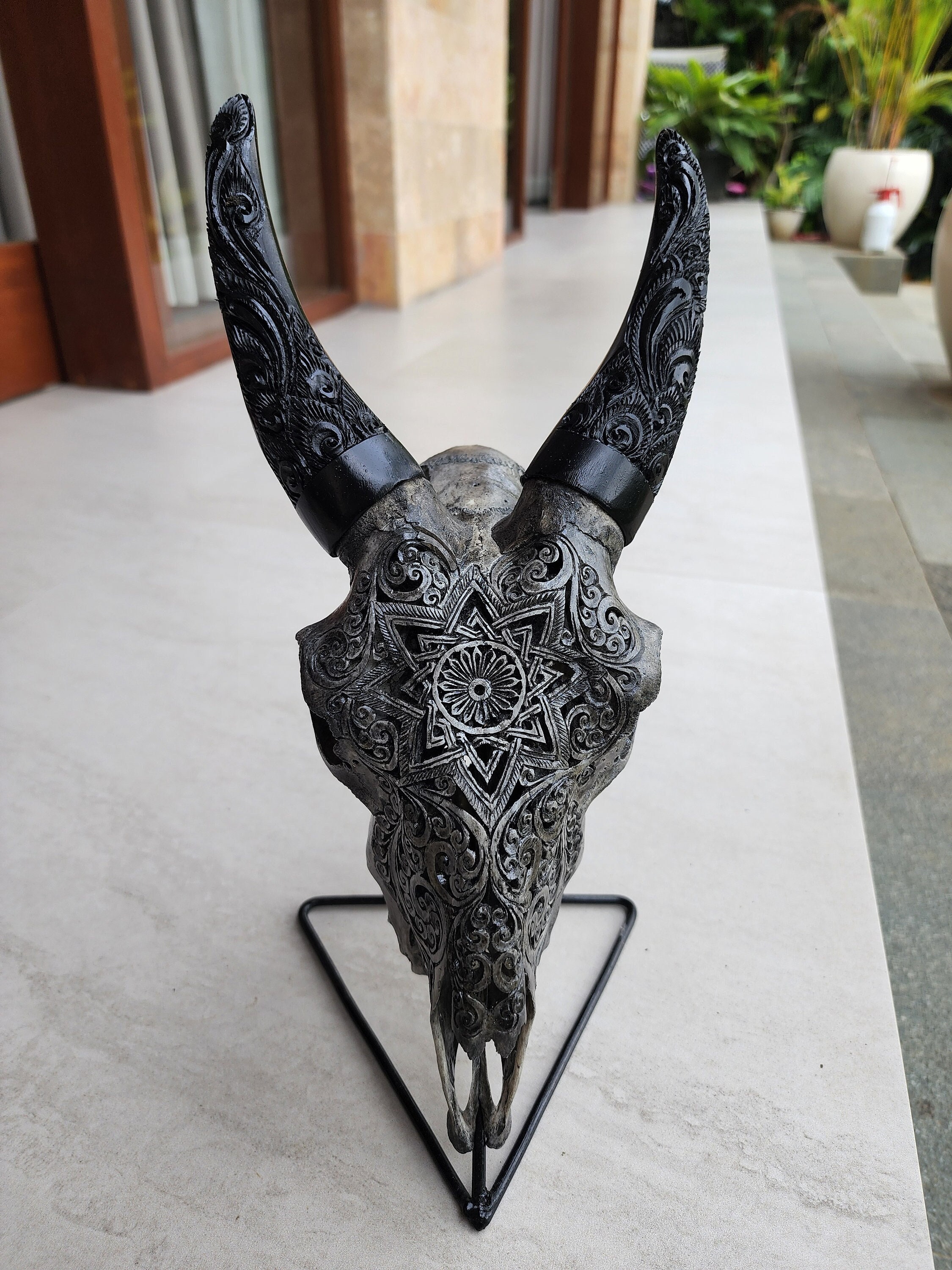 Hand carved goat skull wall decor with an intricate mandala pattern, perfect for tribal, boho, rustic, and farmhouse home decoration. This unique piece is made from real goat skull bone and hand carved by skilled artisans in Bali, Indonesia.