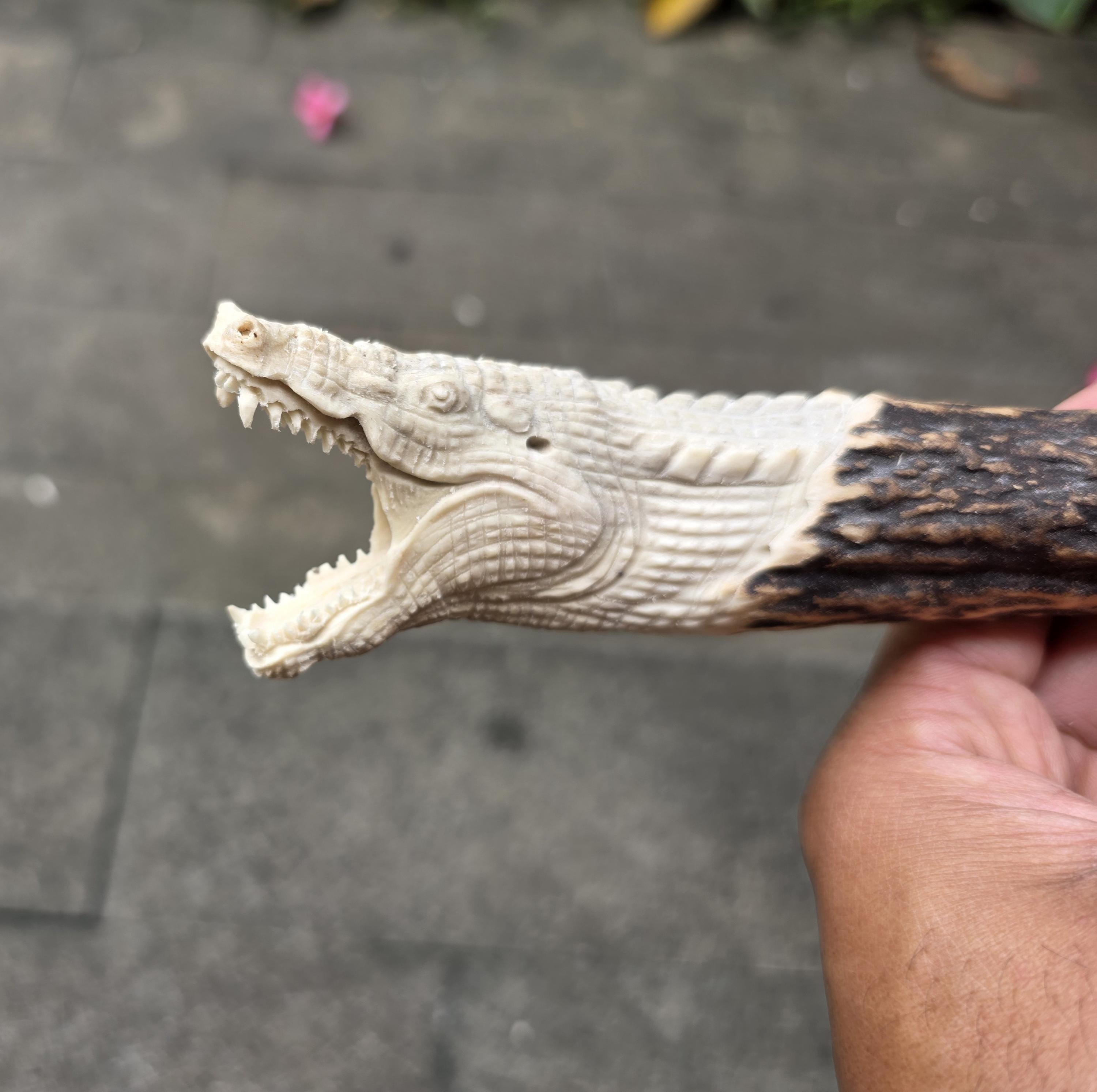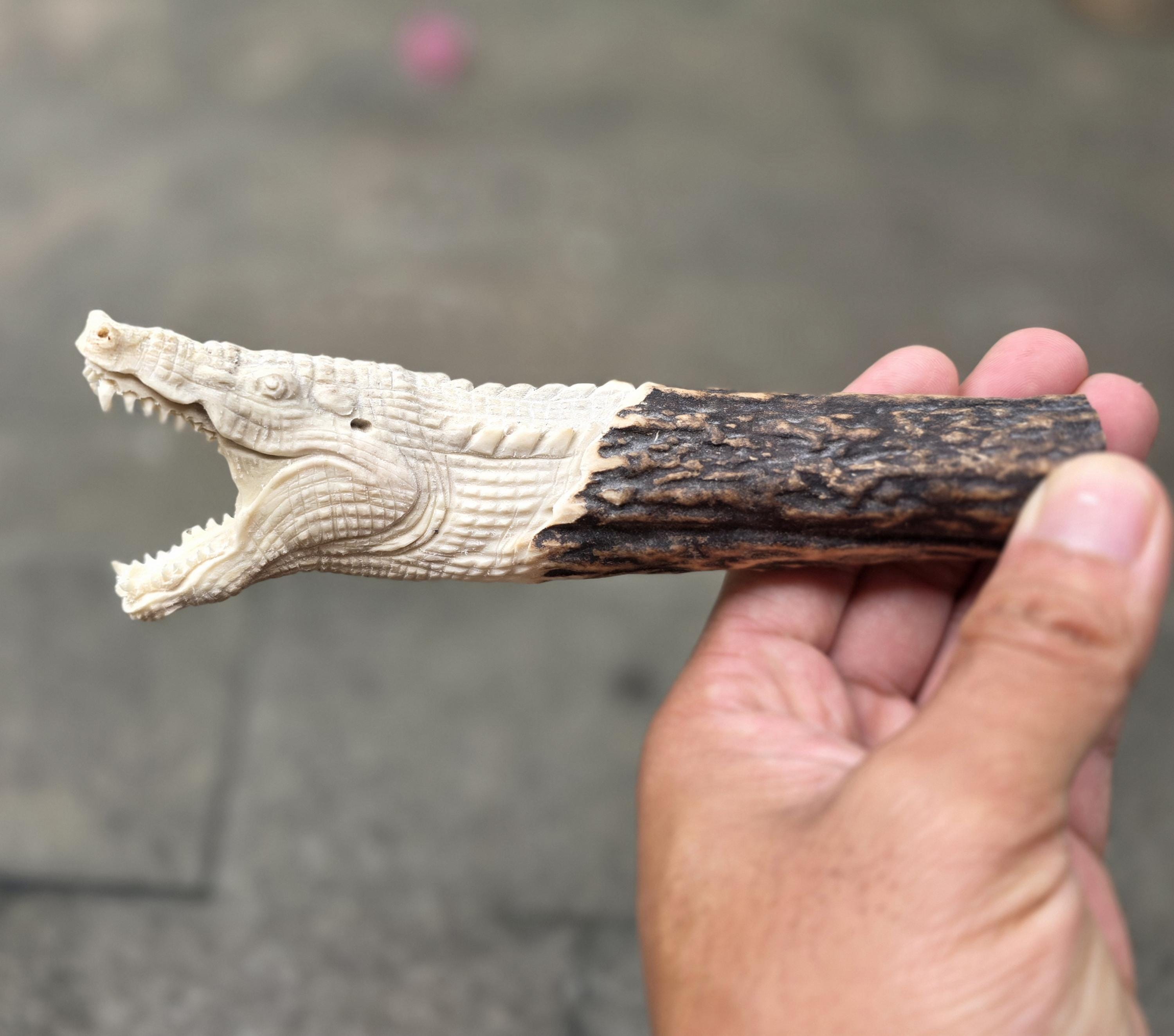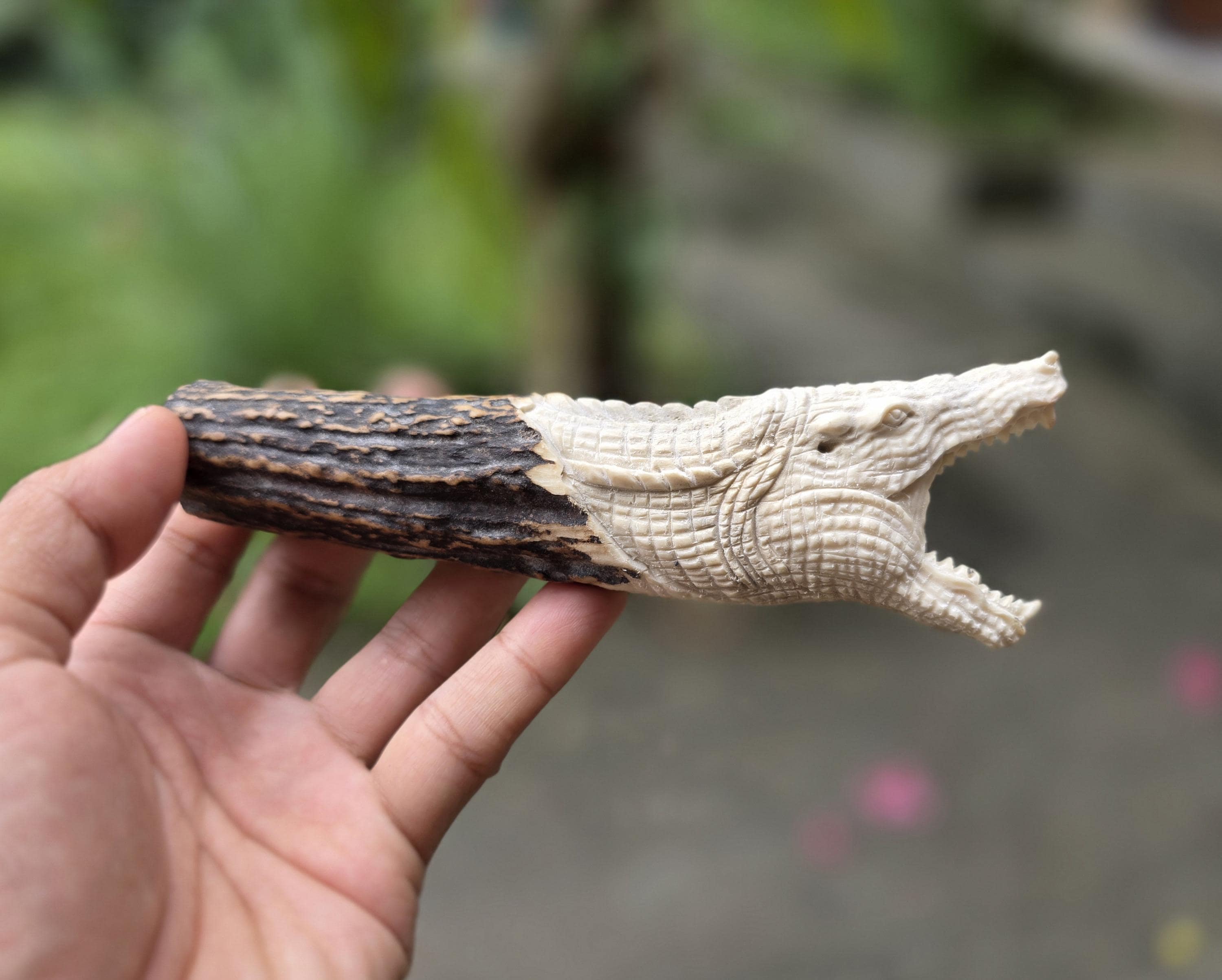 This exceptional crocodile sculpture is meticulously hand carved from genuine deer antler by a skilled artisan. Every scale, curve, and expression is sculpted with precision, showcasing the natural beauty and strength of the material.