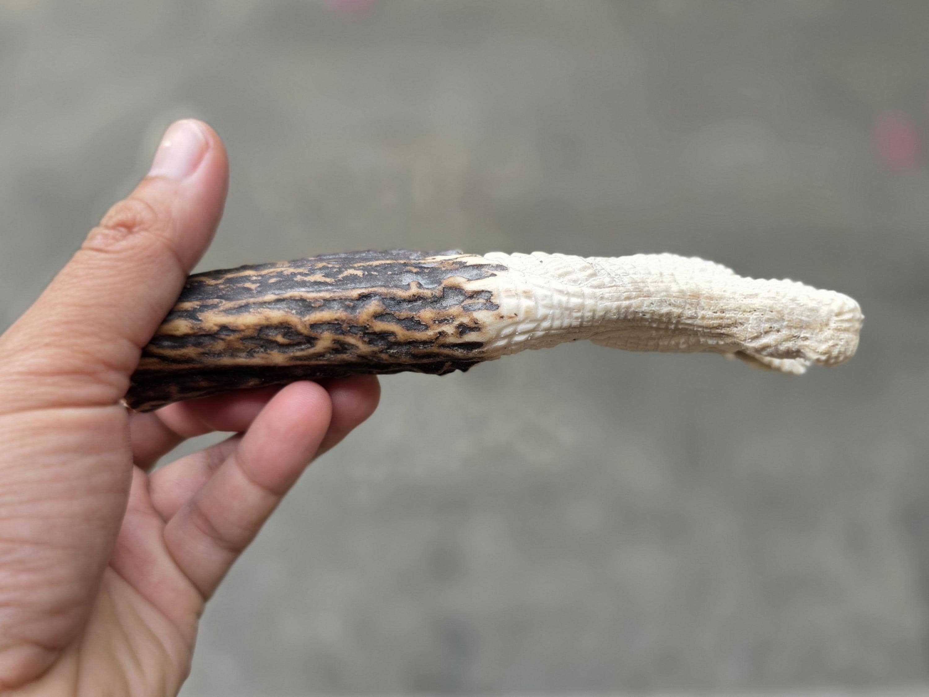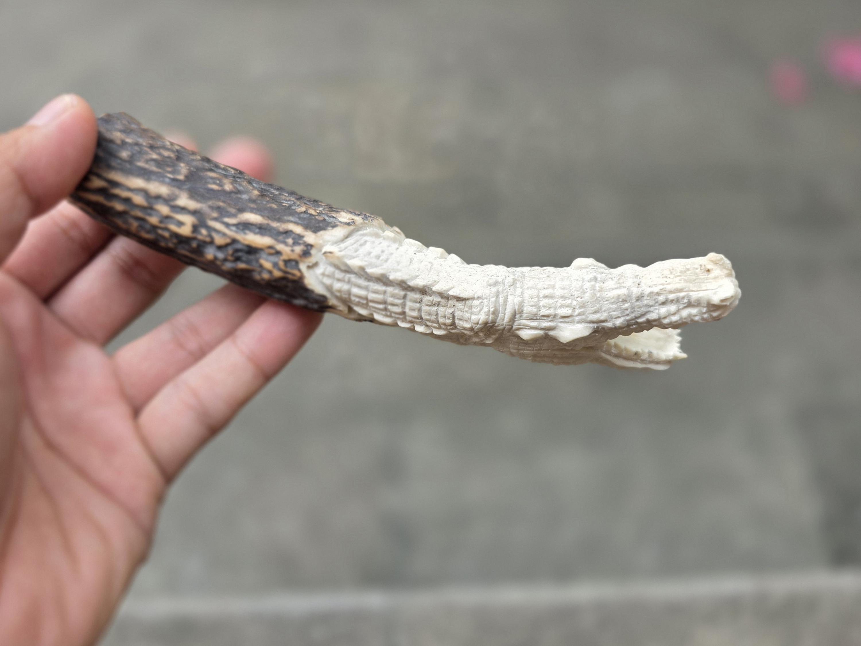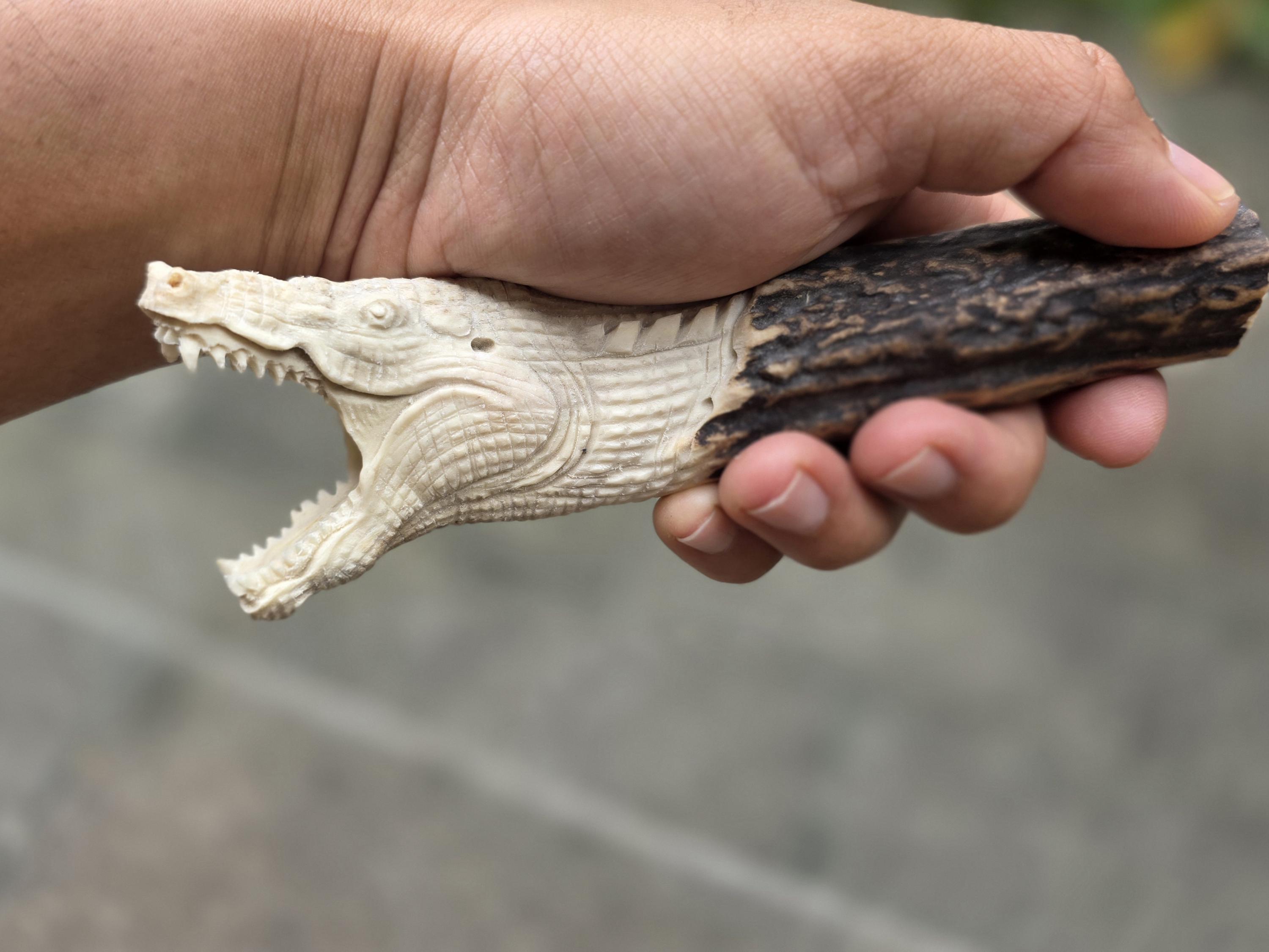 This exceptional crocodile sculpture is meticulously hand carved from genuine deer antler by a skilled artisan. Every scale, curve, and expression is sculpted with precision, showcasing the natural beauty and strength of the material.