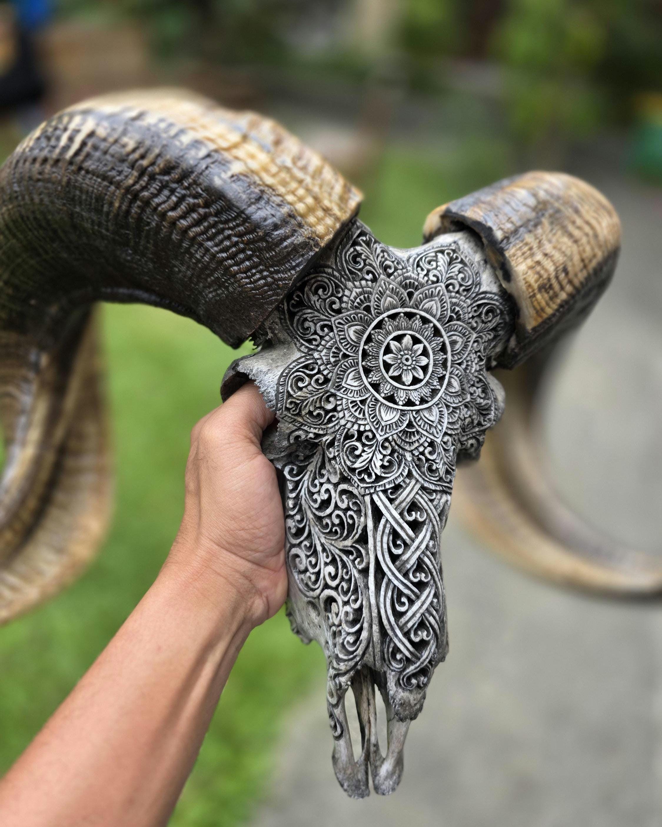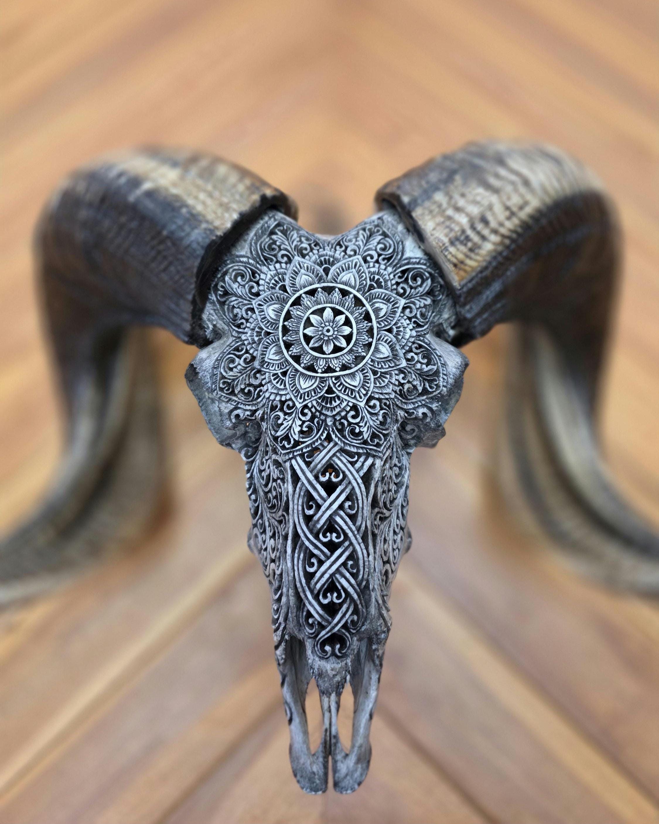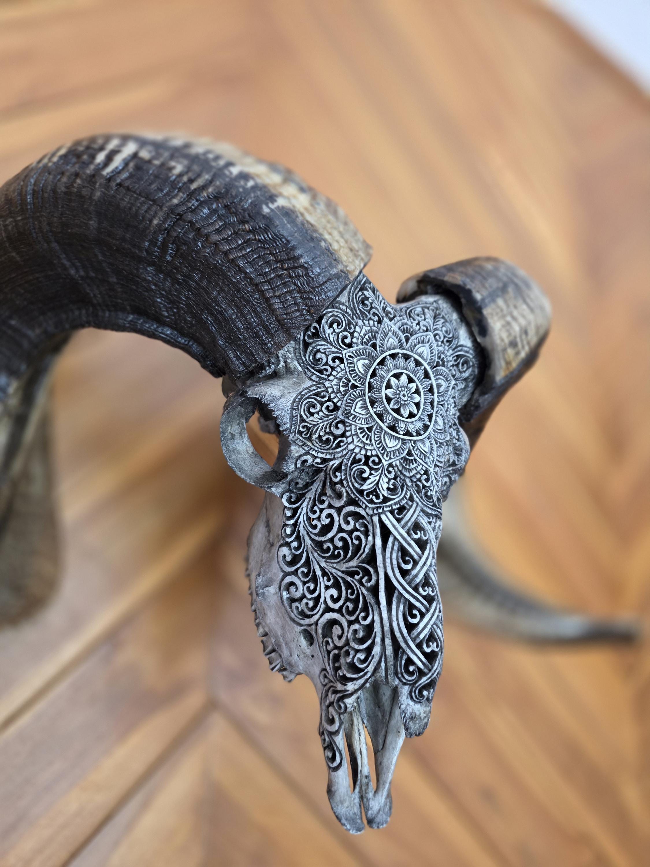 This is a hand-carved ram skull mandala, crafted with extreme attention to detail.