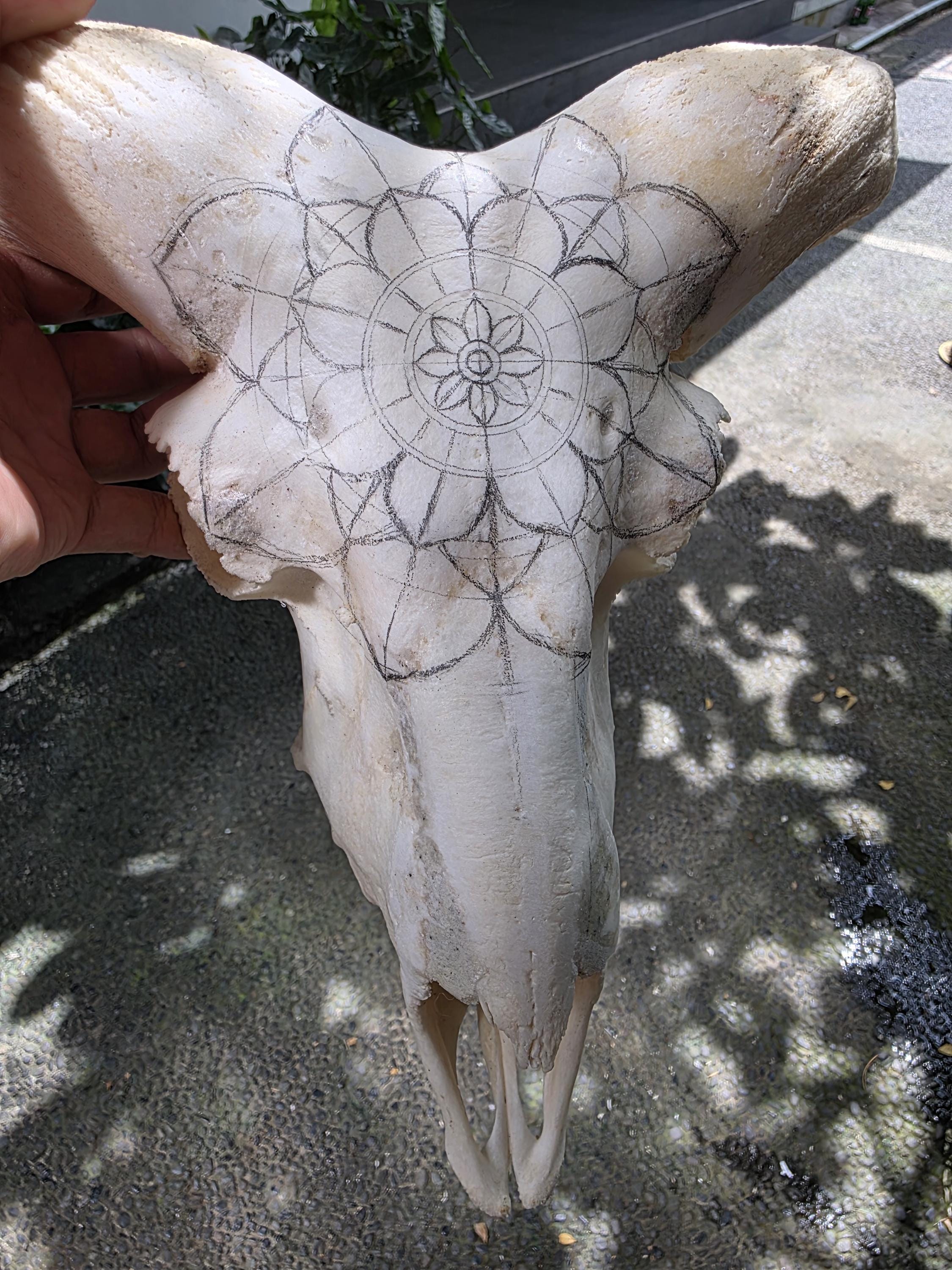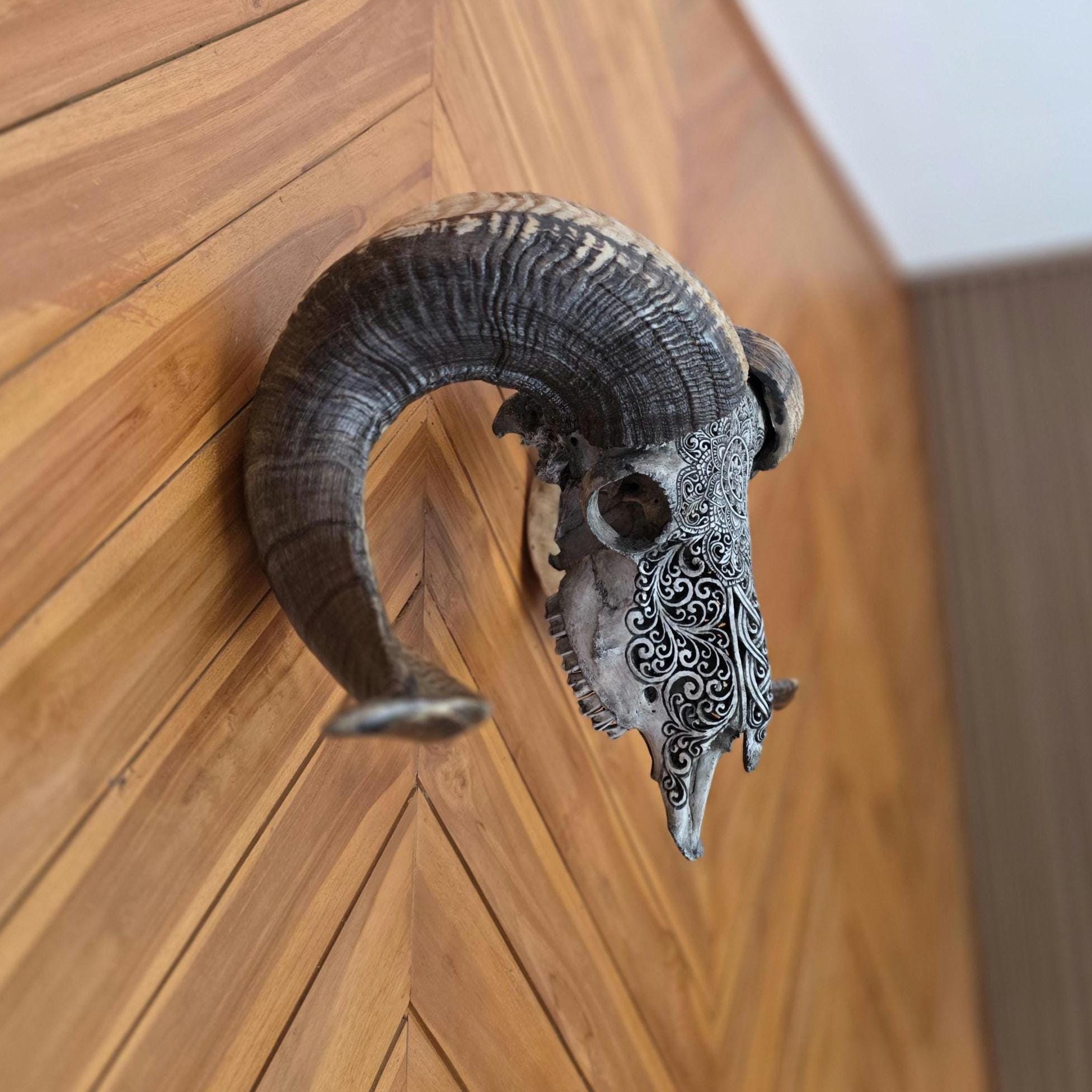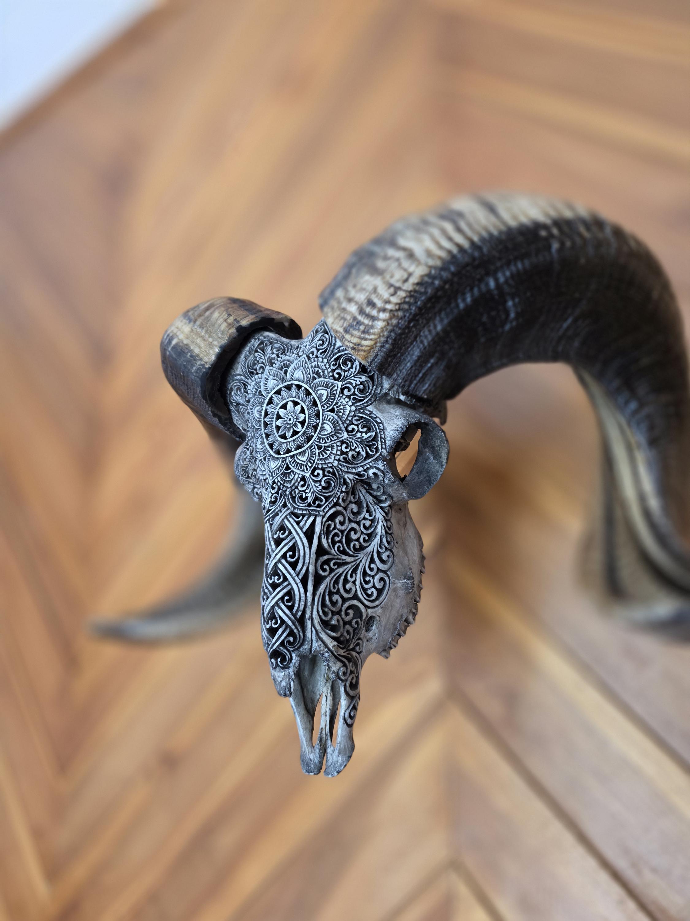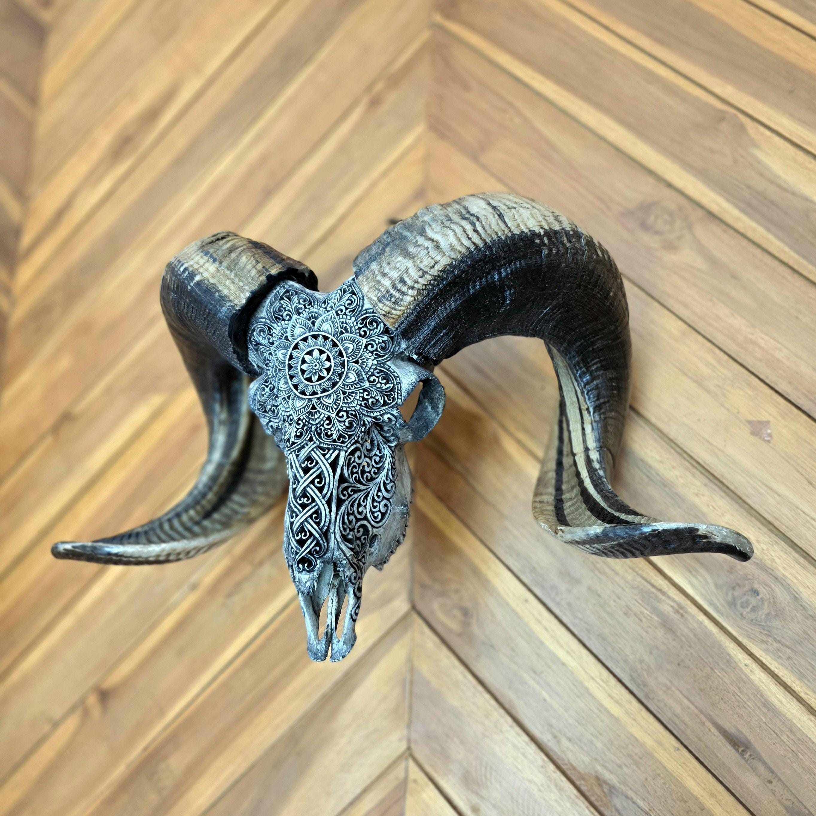This is a hand-carved ram skull mandala, crafted with extreme attention to detail.