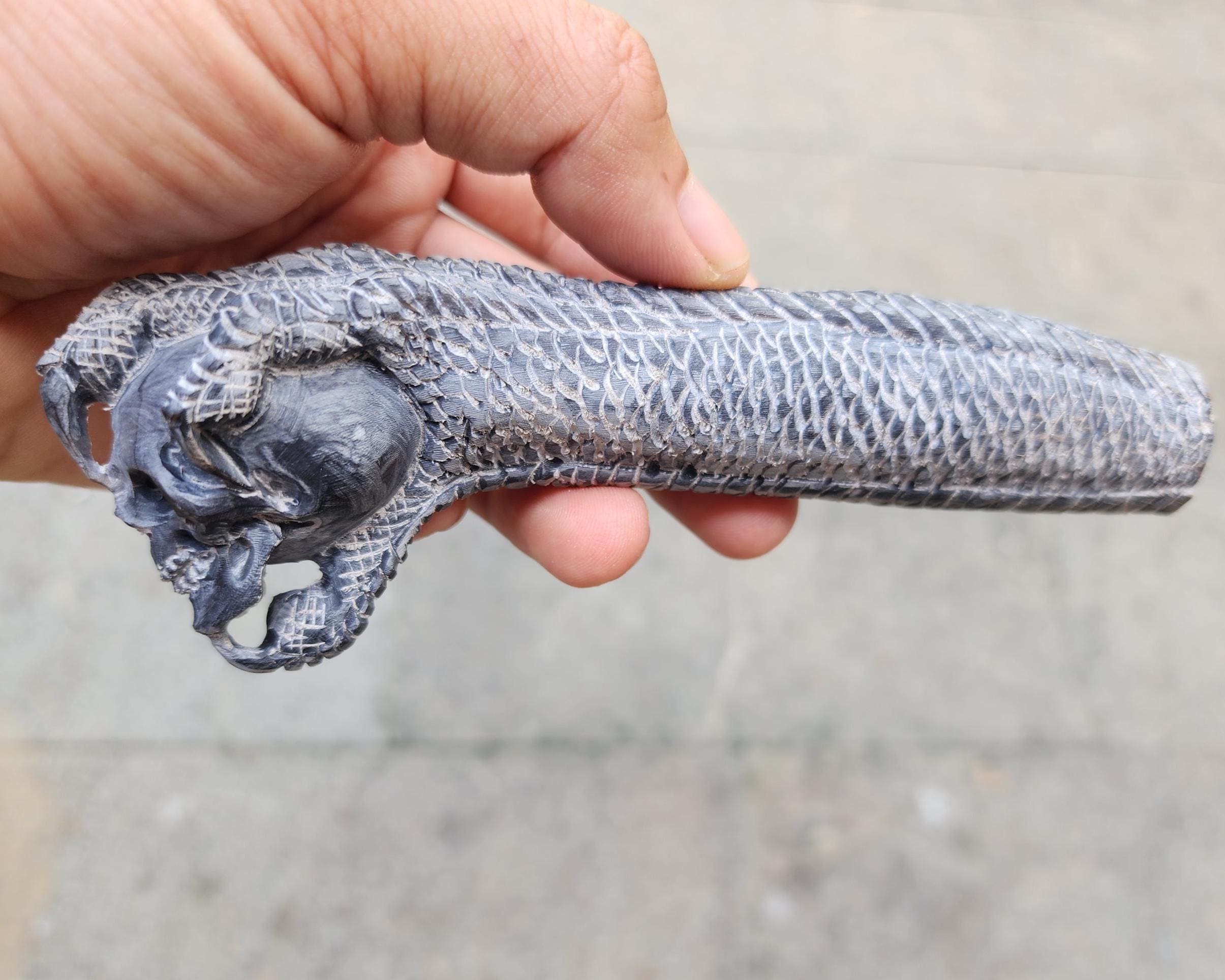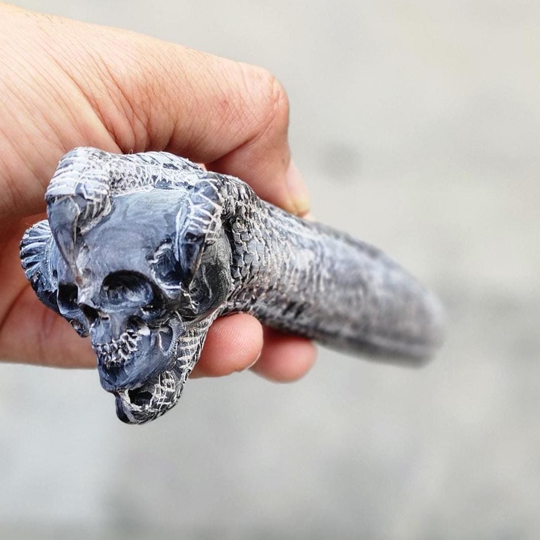 A bold and powerful knife handle carved from natural deer antler, finished in a deep charcoal tone for a dramatic and masculine look.