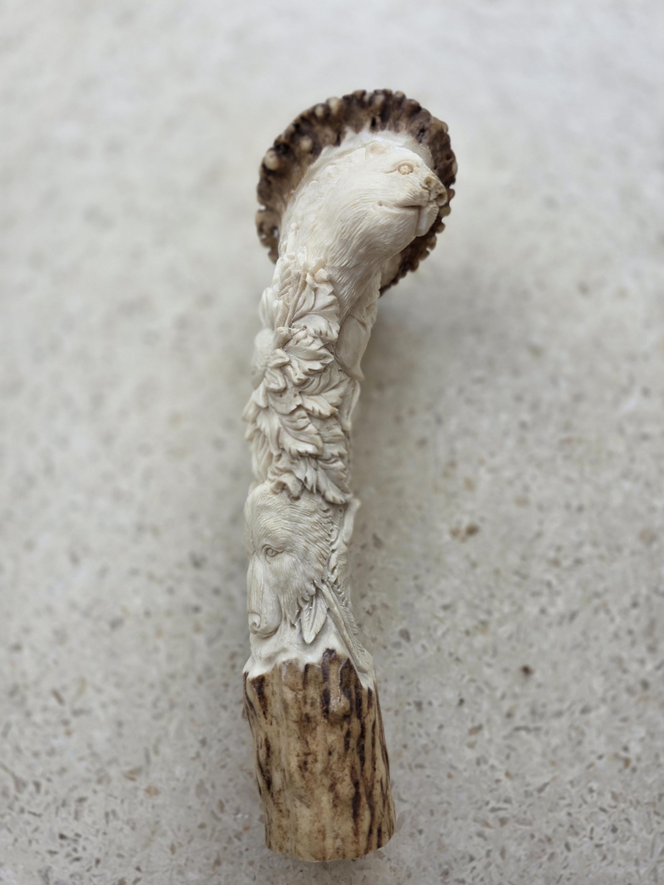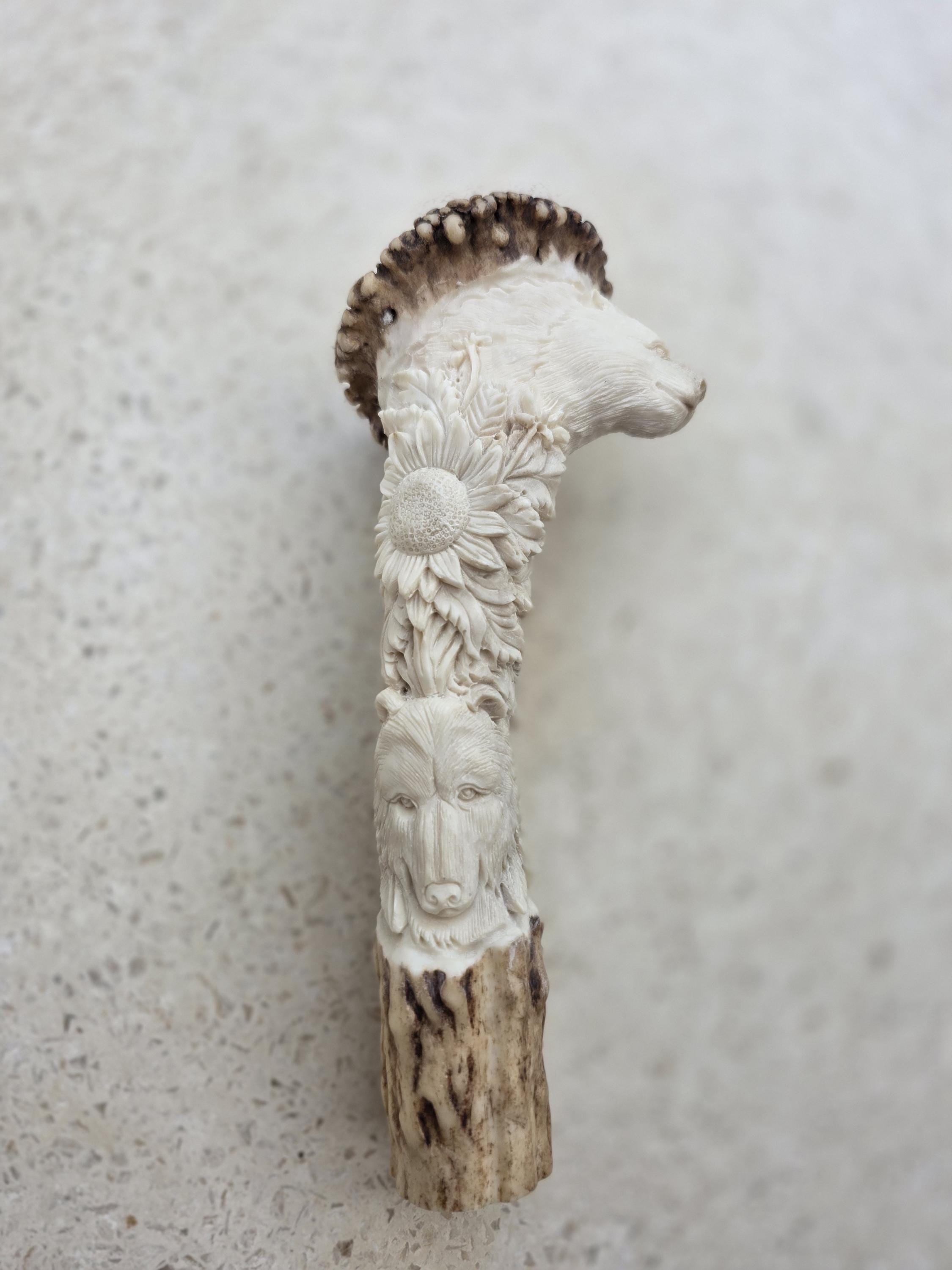 The natural ivory tone of the antler enhances every carved detail, making this piece both a functional handle option and a collectible wildlife artwork.