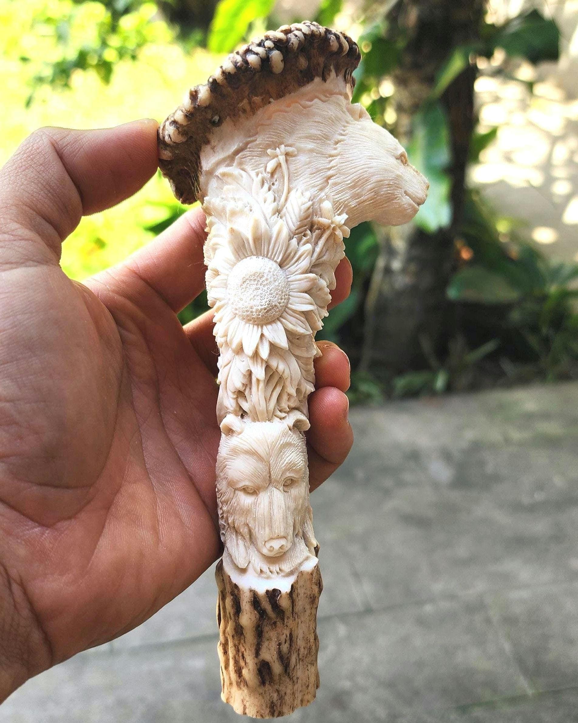 Hand-carved bear head and sunflower made from natural antler, featuring sharp feather details and an open beak expression.