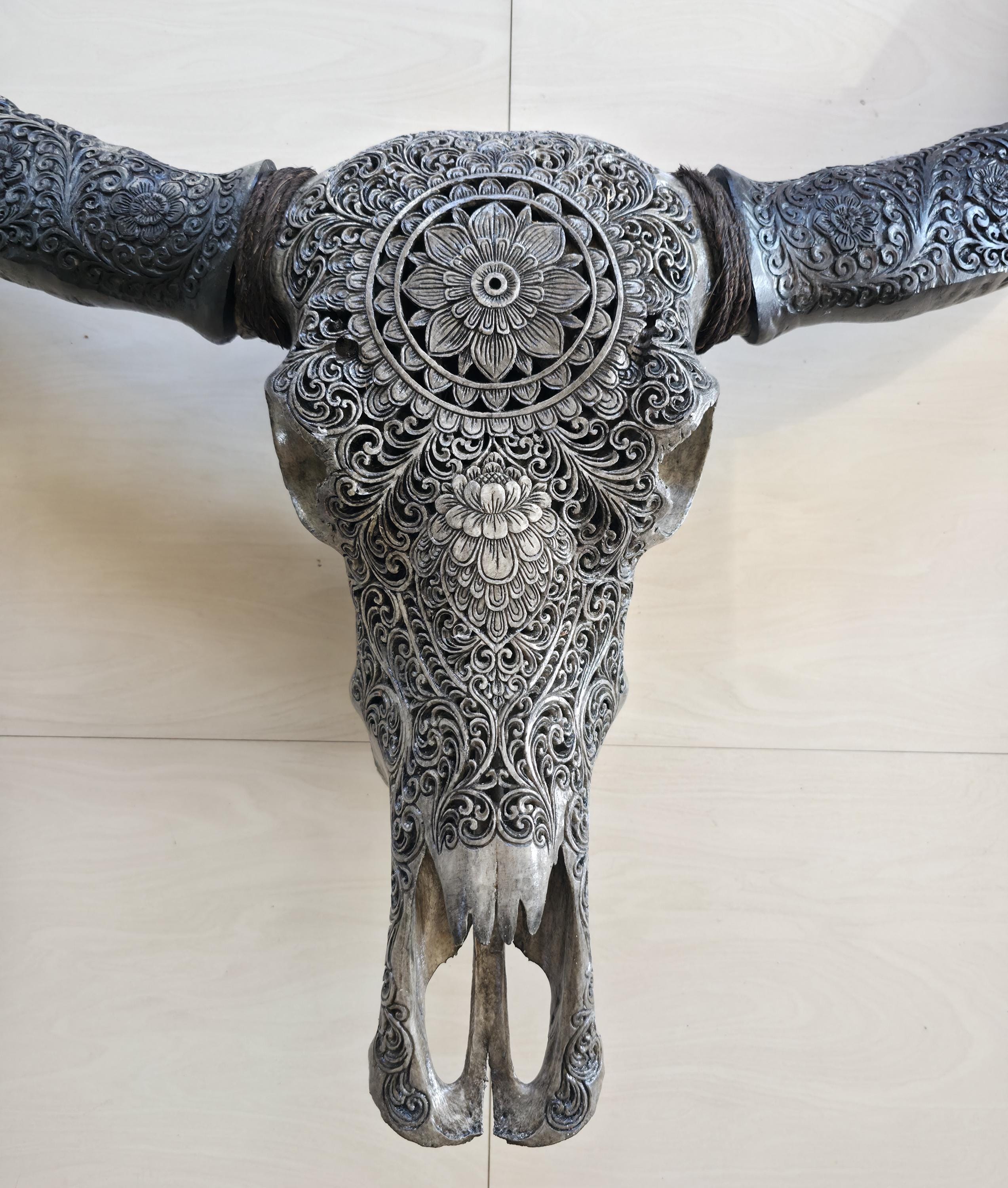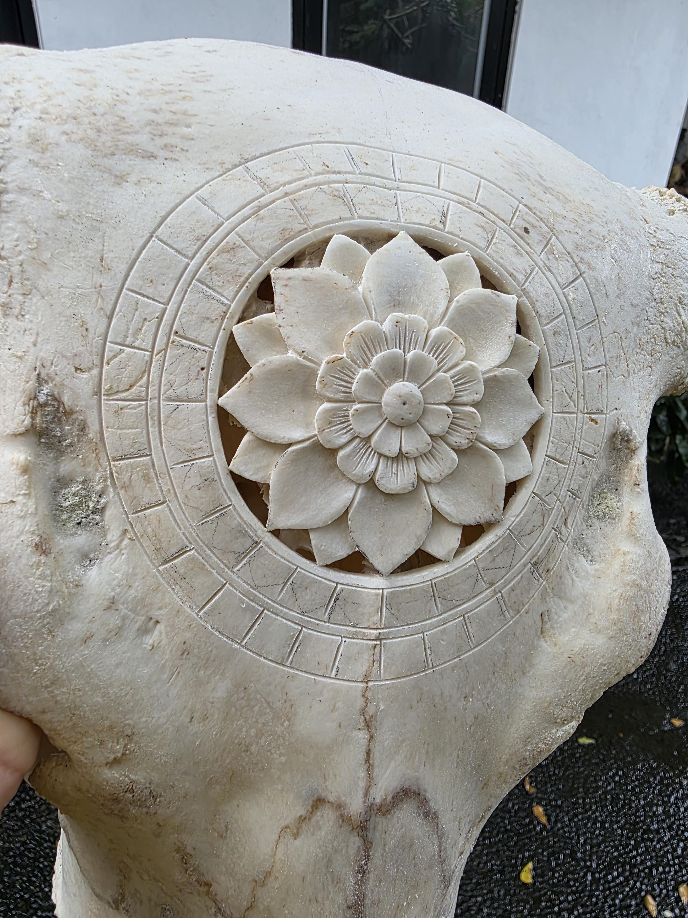 Each skull is ethically sourced and carved by skilled Balinese artisans using intricate mandala and floral motifs symbolizing balance, strength, and harmony. The horns are beautifully engraved in matching patterns, creating a powerful and elegant statement piece for your wall.